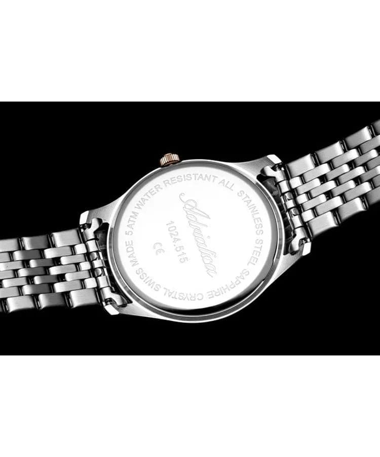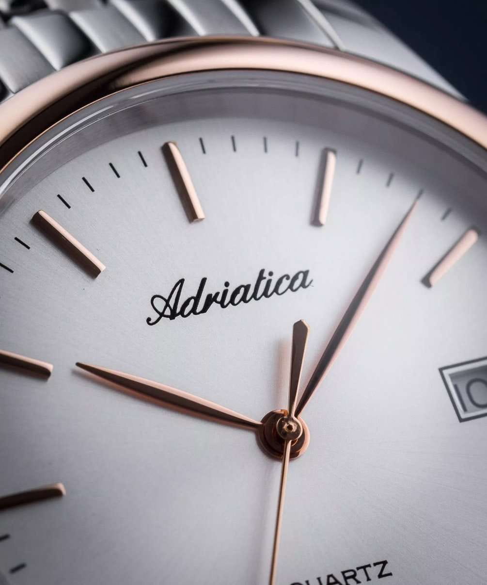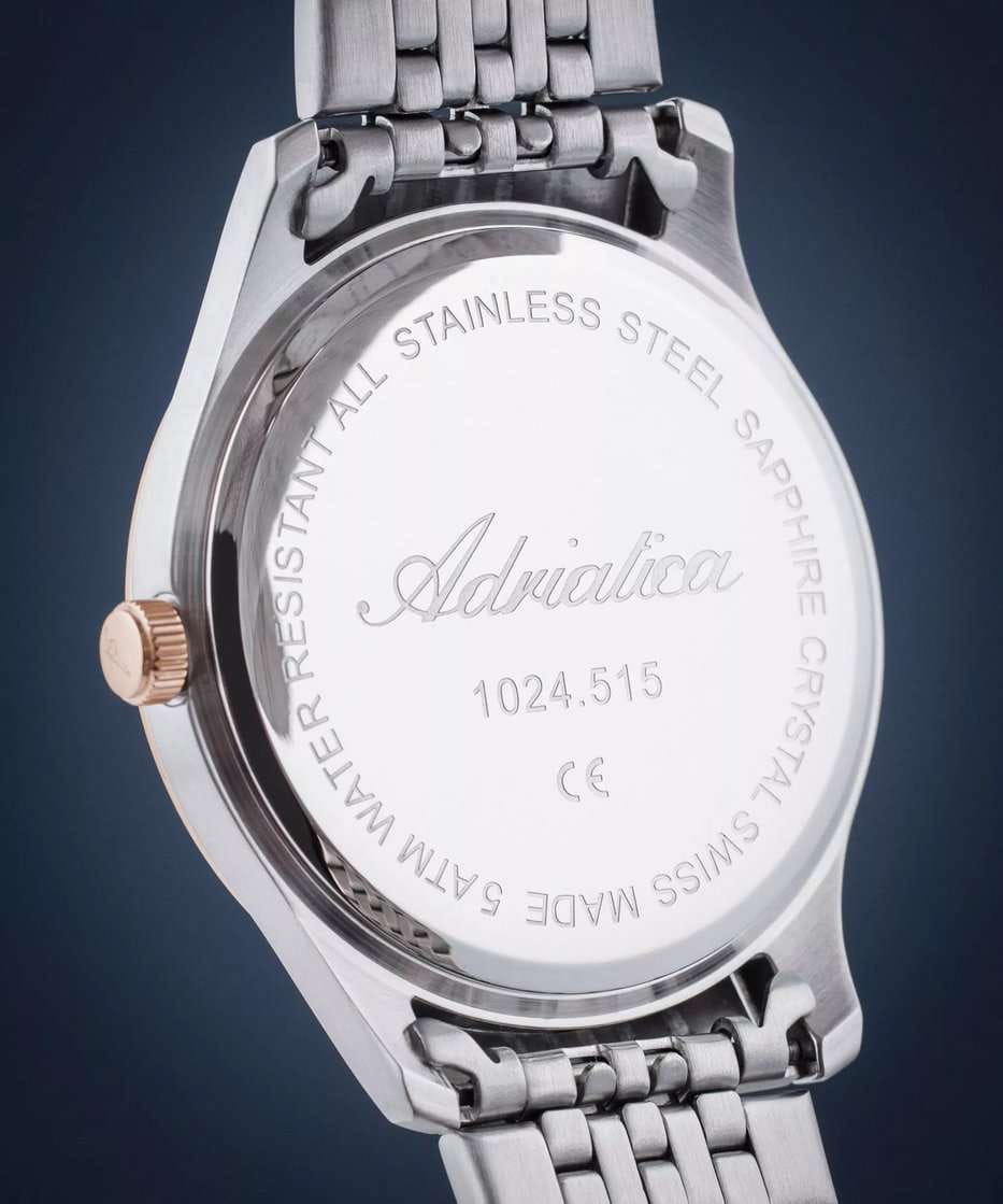 Часы Adriatica A1024.R113Q представляют собой идеальное сочетание элегантности и функциональности, разработанное для современных мужчин. Их стильный циферблат защищен сапфировым стекломСапфировое стеклоПрочный и надёжный материал из кристалла сапфира синтетического происхождения, характеризующийся особой твёрдостью и устойчивостью к царапинам и повреждениям., что придает дополнительную устойчивость к царапинам. Корпус из нержавеющей стали подчеркивает их изысканность и долговечность. Надежный кварцевый механизм с калибром RONDA 515 гарантирует точность времени, а водозащита WR 50 (5 ATM) обеспечивает защиту от воды в различных условиях. Браслет из нержавеющей стали с раскладной застёжкойРаскладная застёжкаТакой тип застёжки используется только на браслетах из металла. Она никогда не раскрывается полностью, происходит разделение на 2 и более частей. Раскладывающая застёжка снизит вероятность потери часов к минимуму., гармонично дополняет общий дизайн и обеспечивает комфортное ношение на запястье. Часы оснащены функцией отображения даты в окошке в положении 3 часа, что добавляет практичности в повседневной жизни. БезельБезельВнешний ободок, закрепляющий стекло. В спортивных часах так называется поворотное кольцо с делениями на циферблате, выполняет роль таймера – замеряет отрезки времени на шкале. Неподвижный безель – элемент декора. Однонаправленно вращающийся безель на дайверских часах позволяет фиксировать моменты погружения и выныривания на поверхность. с PVD-покрытиемPVDУльтратонкое покрытие наносится в технике вакуумного напыления, сочетает в себе нитрид титана особой прочности со слоем золота или оксида хрома. Несёт в себе декоративную или защитную функцию..