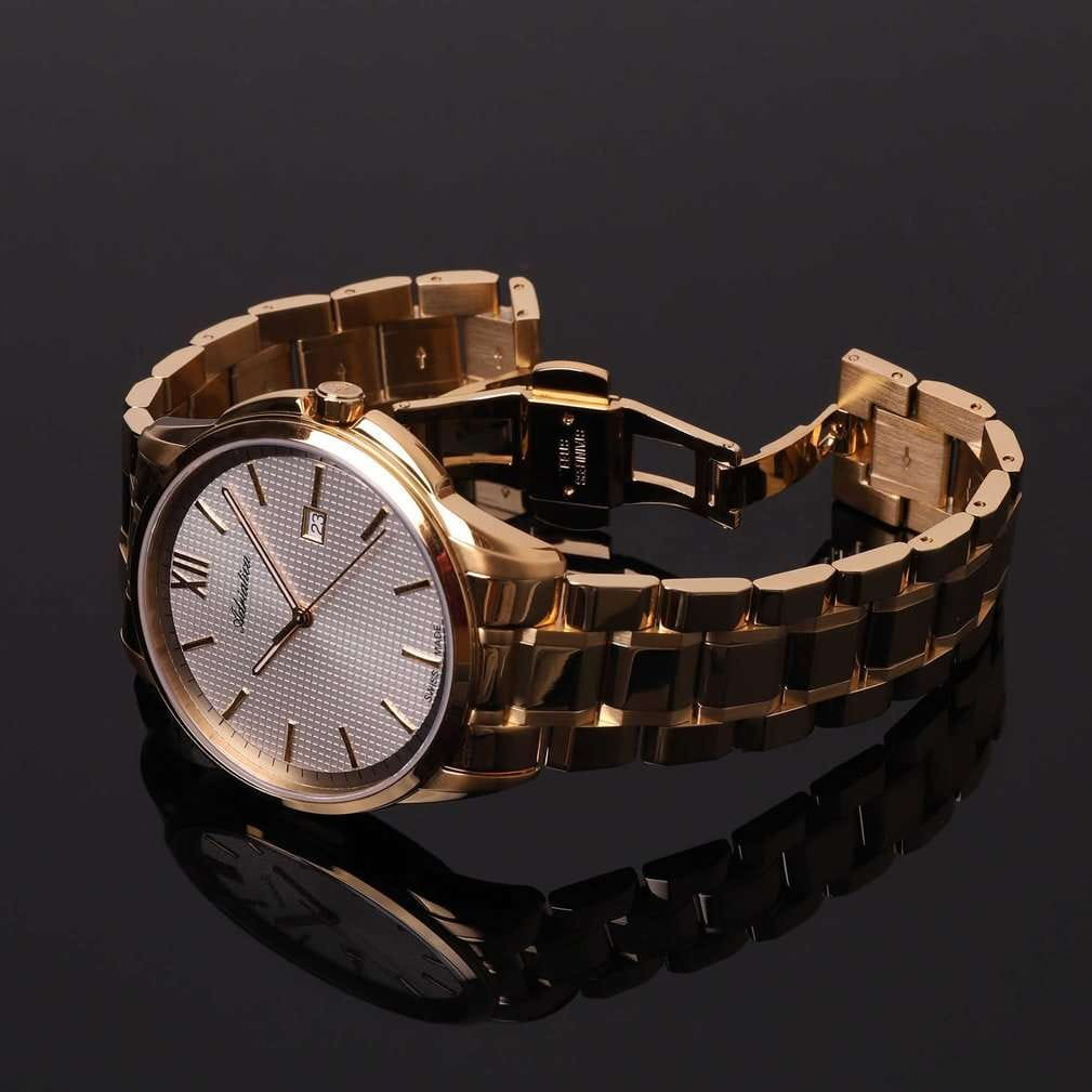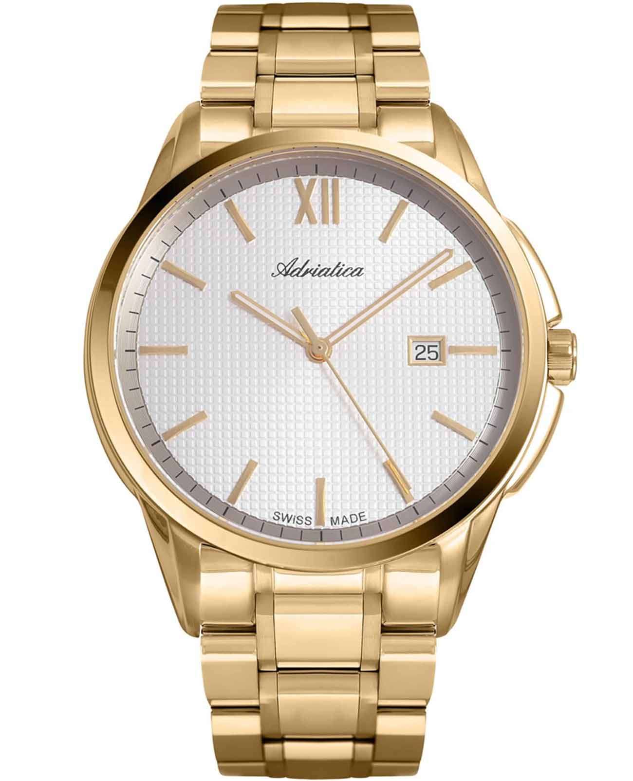 Часы Adriatica A1290.1163Q представляют собой идеальное сочетание элегантности и функциональности, разработанное для современных мужчин. Их стильный циферблат защищен сапфировым стекломСапфировое стеклоПрочный и надёжный материал из кристалла сапфира синтетического происхождения, характеризующийся особой твёрдостью и устойчивостью к царапинам и повреждениям., что придает дополнительную устойчивость к царапинам. Золотистый корпус и безельБезельВнешний ободок, закрепляющий стекло. В спортивных часах так называется поворотное кольцо с делениями на циферблате, выполняет роль таймера – замеряет отрезки времени на шкале. Неподвижный безель – элемент декора. Однонаправленно вращающийся безель на дайверских часах позволяет фиксировать моменты погружения и выныривания на поверхность. выполнен из нержавеющей стали с PVDPVDУльтратонкое покрытие наносится в технике вакуумного напыления, сочетает в себе нитрид титана особой прочности со слоем золота или оксида хрома. Несёт в себе декоративную или защитную функцию. покрытием, подчеркивая их изысканность и долговечность. Надежный кварцевый механизм с калибром ETA F06 (PreciDrive) гарантирует точность времени, а водозащита WR 50 (5 ATM) обеспечивает защиту от воды в различных условиях. Браслет из нержавеющей стали, с PVDPVDУльтратонкое покрытие наносится в технике вакуумного напыления, сочетает в себе нитрид титана особой прочности со слоем золота или оксида хрома. Несёт в себе декоративную или защитную функцию.-покрытием и с застежкой «бабочка»Застёжка "бабочка"Такой вид застёжки дополняется предохранителями, помогающими избежать случайного раскрытия браслета. Обладают изящным исполнением. гармонично дополняет общий дизайн и обеспечивает комфортное ношение на запястье. Часы оснащены функцией отображения даты в окошке в положении 3 часа, что добавляет практичности в повседневной жизни. Люминесцентное покрытиеЛюминесцентное покрытиеПозволяет считывать показания времени в темноте. Производители наносят на стрелки, часовые индексы, безель или поверхность циферблата светонакопительный состав, дающий холодное свечение. на стрелках и метках обеспечивает отличную видимость в темноте.