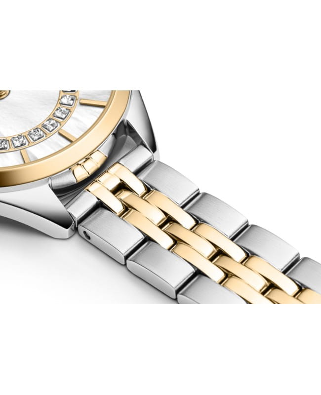 Женские часы с минеральным стекломМинеральное стеклоМинеральное стекло представляет собой искусственно выращенный минерал кварца. Такое стекло отличается особой устойчивостью к повреждениям и царапинам. Уступает по некоторым качествам сапфировому стеклу. Adriatica A3817.211FQ, кварцевый механизм Ronda 783, работающим от батарейки с высокой точностью. Класс водозащиты: 30 метров, позволит защитить корпус от случайных брызг или капель дождя. Корпус часов изготовлен из стали. БезельБезельВнешний ободок, закрепляющий стекло. В спортивных часах так называется поворотное кольцо с делениями на циферблате, выполняет роль таймера – замеряет отрезки времени на шкале. Неподвижный безель – элемент декора. Однонаправленно вращающийся безель на дайверских часах позволяет фиксировать моменты погружения и выныривания на поверхность. с IP-покрытиемIP-покрытиеМетод ионного напыления. Демонстрирует повышенную устойчивость к истиранию, окислению и химическим веществам. Под воздействием высокого давления и температуры около 1500°C молекулы металла надёжно соединяются с частицами корпуса часов..Стальной браслет на раскладной застёжкеРаскладная застёжкаТакой тип застёжки используется только на браслетах из металла. Она никогда не раскрывается полностью, происходит разделение на 2 и более частей. Раскладывающая застёжка снизит вероятность потери часов к минимуму. с IP-покрытиемIP-покрытиеМетод ионного напыления. Демонстрирует повышенную устойчивость к истиранию, окислению и химическим веществам. Под воздействием высокого давления и температуры около 1500°C молекулы металла надёжно соединяются с частицами корпуса часов..