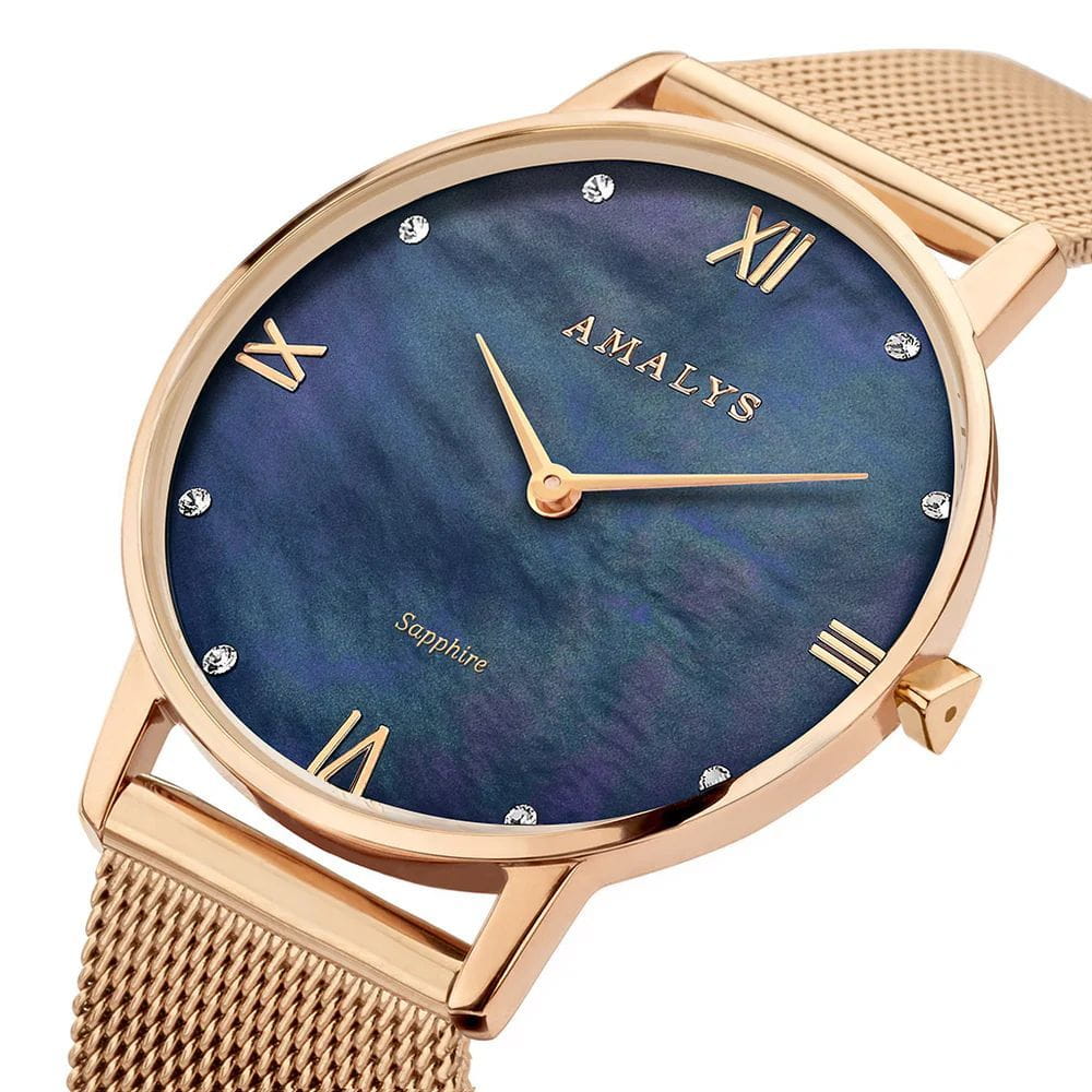 Amalys AMW-182 — женская модель с утончённым классическим дизайном, в которой сочетаются элегантность и практичность. Круглый корпус диаметром 33 мм выполнен из нержавеющей стали с PVD-покрытиемPVDУльтратонкое покрытие наносится в технике вакуумного напыления, сочетает в себе нитрид титана особой прочности со слоем золота или оксида хрома. Несёт в себе декоративную или защитную функцию., гармонирующим с браслетом шириной 16 мм в том же исполнении. Защитную функцию выполняет сапфировое стеклоСапфировое стеклоПрочный и надёжный материал из кристалла сапфира синтетического происхождения, характеризующийся особой твёрдостью и устойчивостью к царапинам и повреждениям., стойкое к царапинам и сохраняющее прозрачность. Механизм — кварцевый, обеспечивающий точность и стабильность хода. Стальной браслет с PVD-покрытиемPVDУльтратонкое покрытие наносится в технике вакуумного напыления, сочетает в себе нитрид титана особой прочности со слоем золота или оксида хрома. Несёт в себе декоративную или защитную функцию. миланского плетения на раскладном замкеРаскладной замокДанный вариант застежки используется только на часах с металлическим браслетом. Отличительная особенность такого крепления в том, что длина браслета становится универсальной и вы можете самостоятельно отрегулировать нужный вам размер – застежка просто двигается по браслету часов. который сочетает надёжность фиксации и удобство повседневного использования. Водозащита 3 ATM защищает часы от случайных брызг и дождя. Циферблат с римскими индексами и изящными стрелками подчёркивает классическую эстетику модели, делая её уместной как в повседневных образах, так и в торжественной обстановке.