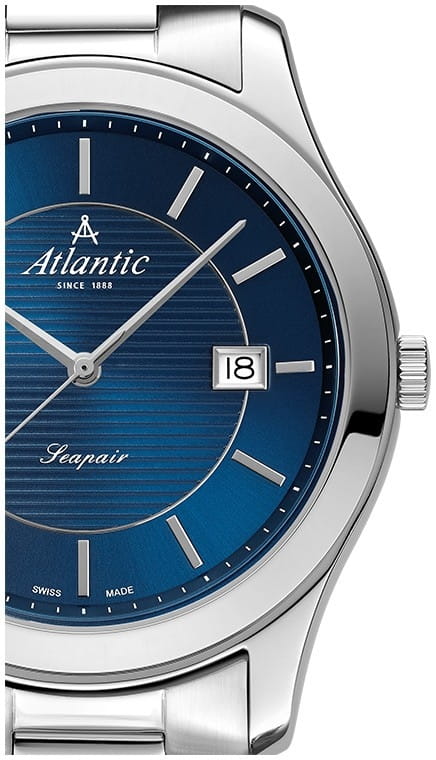 Мужские швейцарские часы Atlantic Seaport 60335.41.51, кварцевый механизм с высокой точностью. Cапфировое стеклоСапфировое стеклоПрочный и надёжный материал из кристалла сапфира синтетического происхождения, характеризующийся особой твёрдостью и устойчивостью к царапинам и повреждениям. устойчивое к появлению царапин и обладающее высокой прозрачностью. Корпус и браслет часов изготовлены из нержавеющей стали. Окошко даты находится в положении 3 часов. Класс водозащиты: 50 метров, позволит защитить корпус от случайных брызг или капель дождя. Стальной браслет на раскладной застёжкеРаскладная застёжкаТакой тип застёжки используется только на браслетах из металла. Она никогда не раскрывается полностью, происходит разделение на 2 и более частей. Раскладывающая застёжка снизит вероятность потери часов к минимуму..