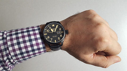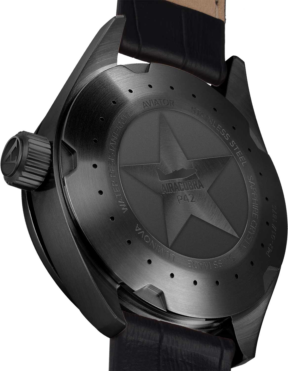 Aviator Airacobra P42 V.1.22.5.157.4 — швейцарские часы в классике авиадизайна, сочетающие безупречную читаемость и высокую надёжность. Корпус диаметром 42 мм выполнен из нержавеющей стали с элегантным PVD-покрытиемPVDУльтратонкое покрытие наносится в технике вакуумного напыления, сочетает в себе нитрид титана особой прочности со слоем золота или оксида хрома. Несёт в себе декоративную или защитную функцию.. Матовый циферблат с крупными арабскими цифрами, широкими стрелками и контрастной шкалой минут обеспечивает точную и быструю считываемость информации — как и положено настоящим пилотским часам. У отметки «3 часа» — окошко даты. Часовые метки и стрелки покрыты люминесцентным покрытиемЛюминесцентное покрытиеПозволяет считывать показания времени в темноте. Производители наносят на стрелки, часовые индексы, безель или поверхность циферблата светонакопительный состав, дающий холодное свечение. Superluminova, позволяющим легко определять время даже в тёмное время суток.Поверхность защищена прочным сапфировым стекломСапфировое стеклоПрочный и надёжный материал из кристалла сапфира синтетического происхождения, характеризующийся особой твёрдостью и устойчивостью к царапинам и повреждениям. с антибликовым покрытиемАнтибликовое покрытиеСлой оксида металла в 0,13-0,3 микрон, благодаря которому стекло часов не бликует и не отражает свет. Антибликовое покрытие уменьшает отражение света в 10 раз, обеспечивая отличную читаемость показателей циферблата., устойчивым к царапинам. Сердце модели — швейцарский кварцевый механизм Ronda 519, известный своей точностью и долговечностью. Корпус герметичен до 100 метров, что обеспечивает уверенную и надёжную защиту от влаги. Модель дополнена кожаным ремешком с выразительной текстурой и классическим стилем, закреплённым с помощью стандартной застежки — для максимального комфорта и лёгкости в повседневном использовании. Aviator — это образец лётной точности, инженерной чёткости и сдержанной роскоши, идеально подходящий для тех, кто ценит функциональность и уверенность в каждом элементе.