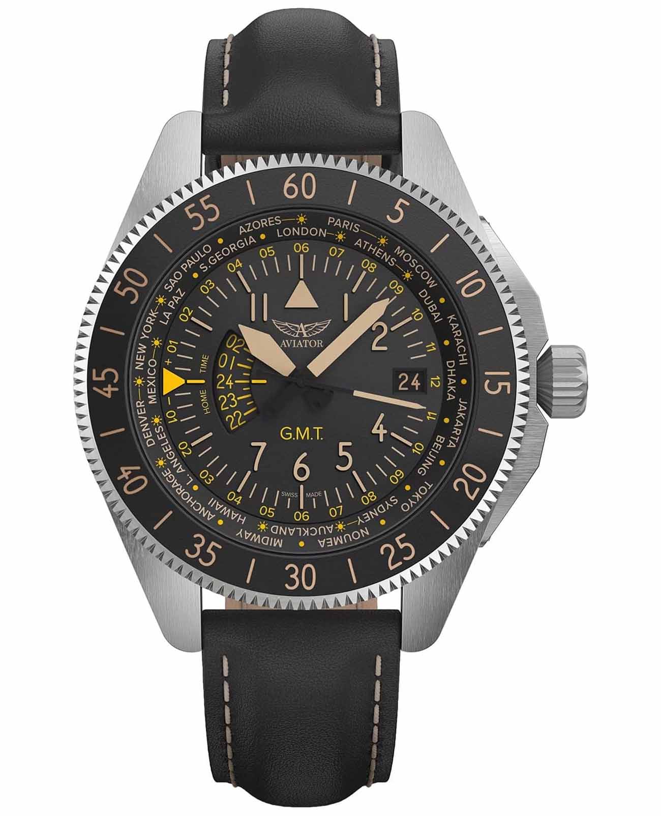 Aviator Airacobra V.1.37.0.303.4 “Airacobra GMT” — сбалансированный швейцарский пилотский GMT, сочетающий техническую строгость с удобными функциями для путешествий. Корпус диаметром 43 мм из нержавеющей стали обеспечивает уверенное ощущение надёжности, а герметичность до 100 м защищает при любой погоде .