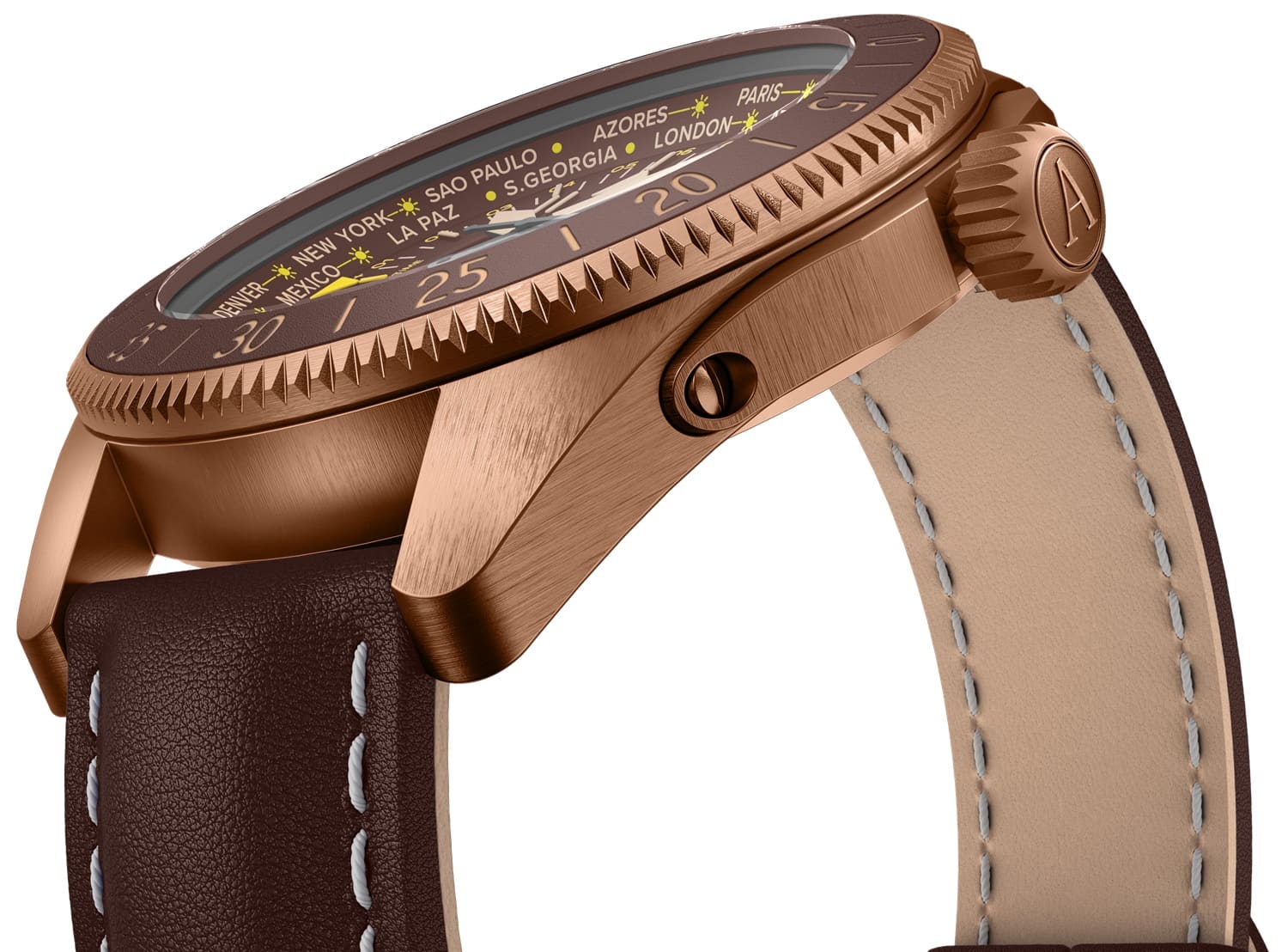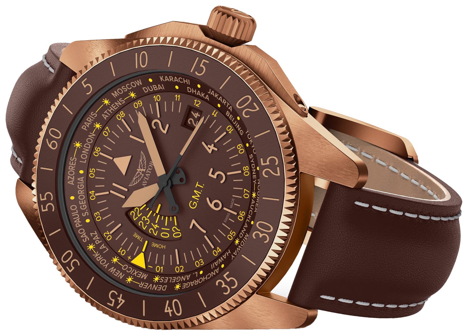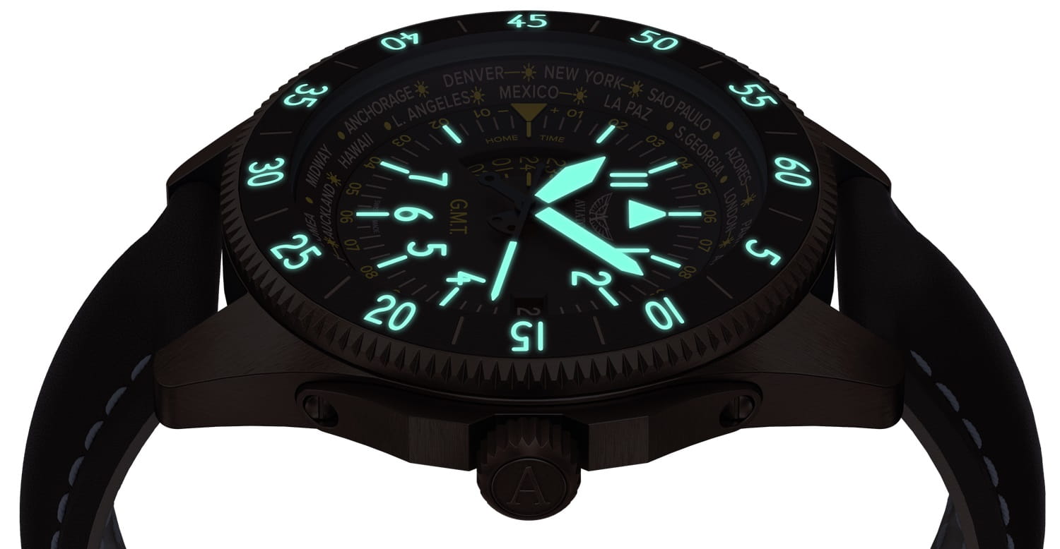 Aviator Airacobra GMT V.1.37.8.306.4 — сбалансированный швейцарский пилотский GMT, сочетающий техническую строгость с удобными функциями для путешествий. Корпус диаметром 42.8 мм и поворотный безельБезельВнешний ободок, закрепляющий стекло. В спортивных часах так называется поворотное кольцо с делениями на циферблате, выполняет роль таймера – замеряет отрезки времени на шкале. Неподвижный безель – элемент декора. Однонаправленно вращающийся безель на дайверских часах позволяет фиксировать моменты погружения и выныривания на поверхность. с керамической вставкой из нержавеющей стали 316 L с PVD-покрытиемPVDУльтратонкое покрытие наносится в технике вакуумного напыления, сочетает в себе нитрид титана особой прочности со слоем золота или оксида хрома. Несёт в себе декоративную или защитную функцию. обеспечивает уверенное ощущение надёжности, а герметичность до 100 м защищает при любой погоде. Циферблат отличается детальной функциональностью: в центре — крупные арабские цифры и стрелки, покрытые люминесцентным покрытиемЛюминесцентное покрытиеПозволяет считывать показания времени в темноте. Производители наносят на стрелки, часовые индексы, безель или поверхность циферблата светонакопительный состав, дающий холодное свечение. Superluminova, обеспечивающими мгновенное считывание времени даже в темноте. На «3 часах» — окошко даты, а индикатор второго часового пояса (GMT) удобно расположен на «9 часах». Безель с градусной шкалой для секунд — идеален для расчёта времени пути или времени прибытия. Циферблат защищён сапфировым стекломСапфировое стеклоПрочный и надёжный материал из кристалла сапфира синтетического происхождения, характеризующийся особой твёрдостью и устойчивостью к царапинам и повреждениям. с антибликовым покрытиемАнтибликовое покрытиеСлой оксида металла в 0,13-0,3 микрон, благодаря которому стекло часов не бликует и не отражает свет. Антибликовое покрытие уменьшает отражение света в 10 раз, обеспечивая отличную читаемость показателей циферблата., гарантирующим чёткий обзор без отражений. Кожаный ремень со стандартной застежкой сочетает в себе комфорт, элегантность и практичность. Airacobra GMT — инструментальное сочетание часовой точности, удобной функциональности GMT и авиационной эстетики, предназначенное для тех, кто ценит практичность и стиль в равной мере.