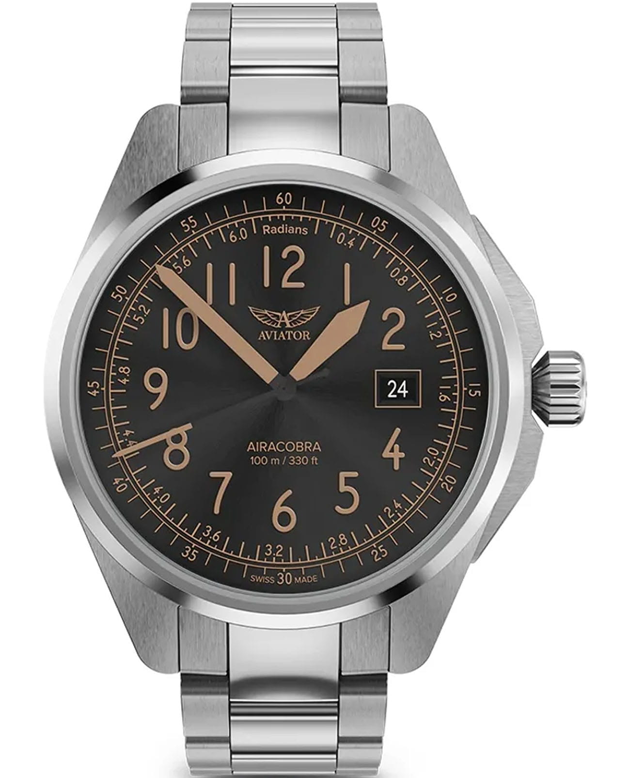 Aviator Airacobra 43 Type B V.1.38.0.323.5 — надёжные швейцарские пилотские часы с насыщенным функционалом и строгим авиационным дизайном. Корпус диаметром 42,8 мм выполнен из нержавеющей стали 316L. Элегантный циферблат имеет крупные арабские цифры. Стрелки и метки покрыты люминесцентным покрытиемЛюминесцентное покрытиеПозволяет считывать показания времени в темноте. Производители наносят на стрелки, часовые индексы, безель или поверхность циферблата светонакопительный состав, дающий холодное свечение. Superluminova — это обеспечивает отличную читаемость в любых условиях. Окошко даты расположено у отметки «3 часа». На борту установлен швейцарский кварцевый механизм, способный с высокой точностью отображать время, дату. В механизме 4 камня. Изысканный циферблат защищён стойким сапфировым стекломСапфировое стеклоПрочный и надёжный материал из кристалла сапфира синтетического происхождения, характеризующийся особой твёрдостью и устойчивостью к царапинам и повреждениям. с антибликовым покрытиемАнтибликовое покрытиеСлой оксида металла в 0,13-0,3 микрон, благодаря которому стекло часов не бликует и не отражает свет. Антибликовое покрытие уменьшает отражение света в 10 раз, обеспечивая отличную читаемость показателей циферблата., завинчивающаяся заводная головка и задняя крышка обеспечивают уровень водозащиты до 100 метров. Стальной браслет с раскладной застёжкойРаскладная застёжкаТакой тип застёжки используется только на браслетах из металла. Она никогда не раскрывается полностью, происходит разделение на 2 и более частей. Раскладывающая застёжка снизит вероятность потери часов к минимуму. обеспечивает удобство и надёжную фиксацию. Airacobra 43 Type B — инструментальные пилотские часы для тех, кто ценит надёжность, точность и удобную функциональность второго часового пояса в эстетике классических авиационных хронометров. Лимитированная серия.