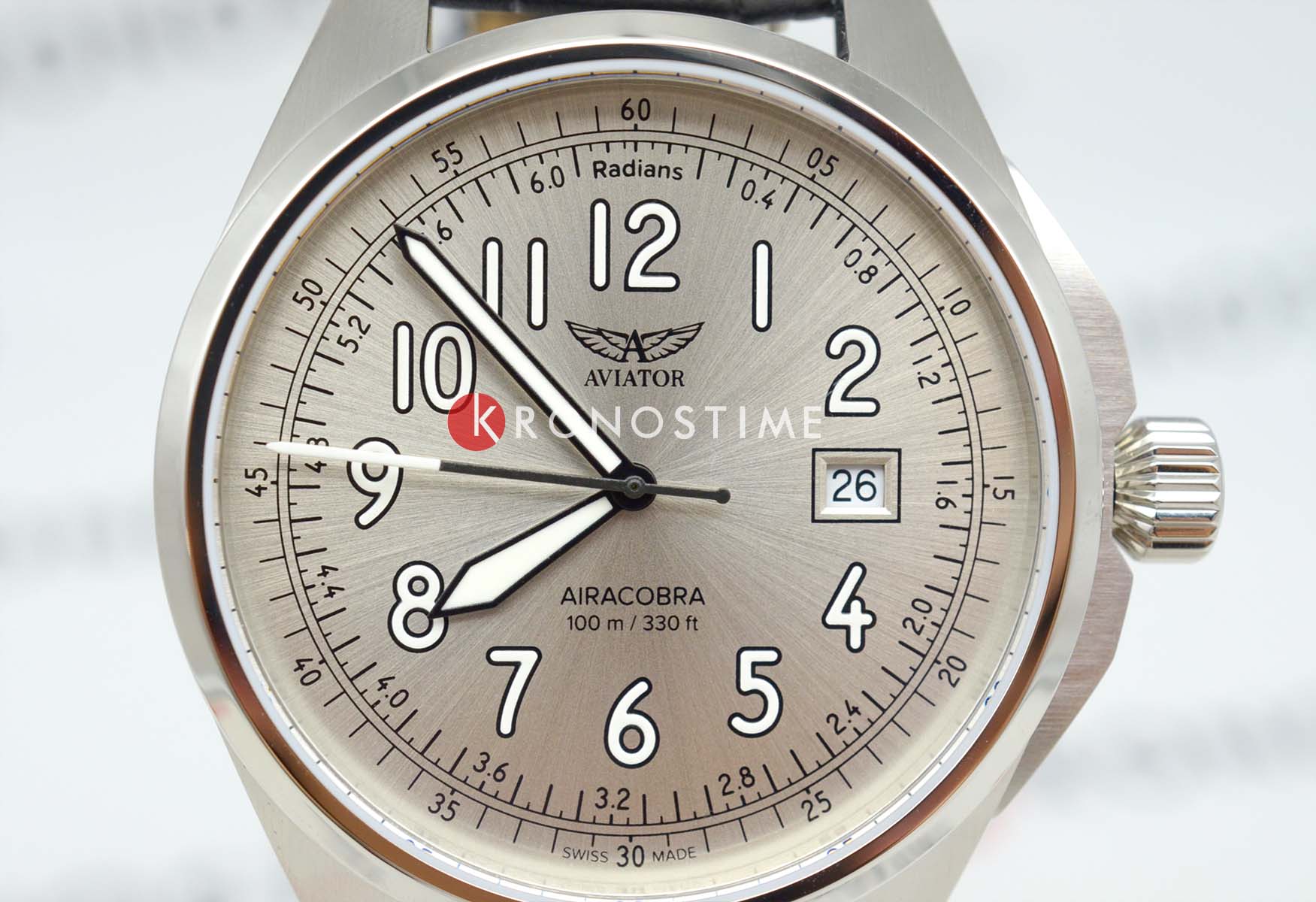 Aviator V.1.38.0.327.4 “Airacobra 43 Type A” — надёжные швейцарские пилотские часы с насыщенным функционалом и строгим авиационным дизайном. Корпус диаметром 42,8 мм выполнен из нержавеющей стали.
