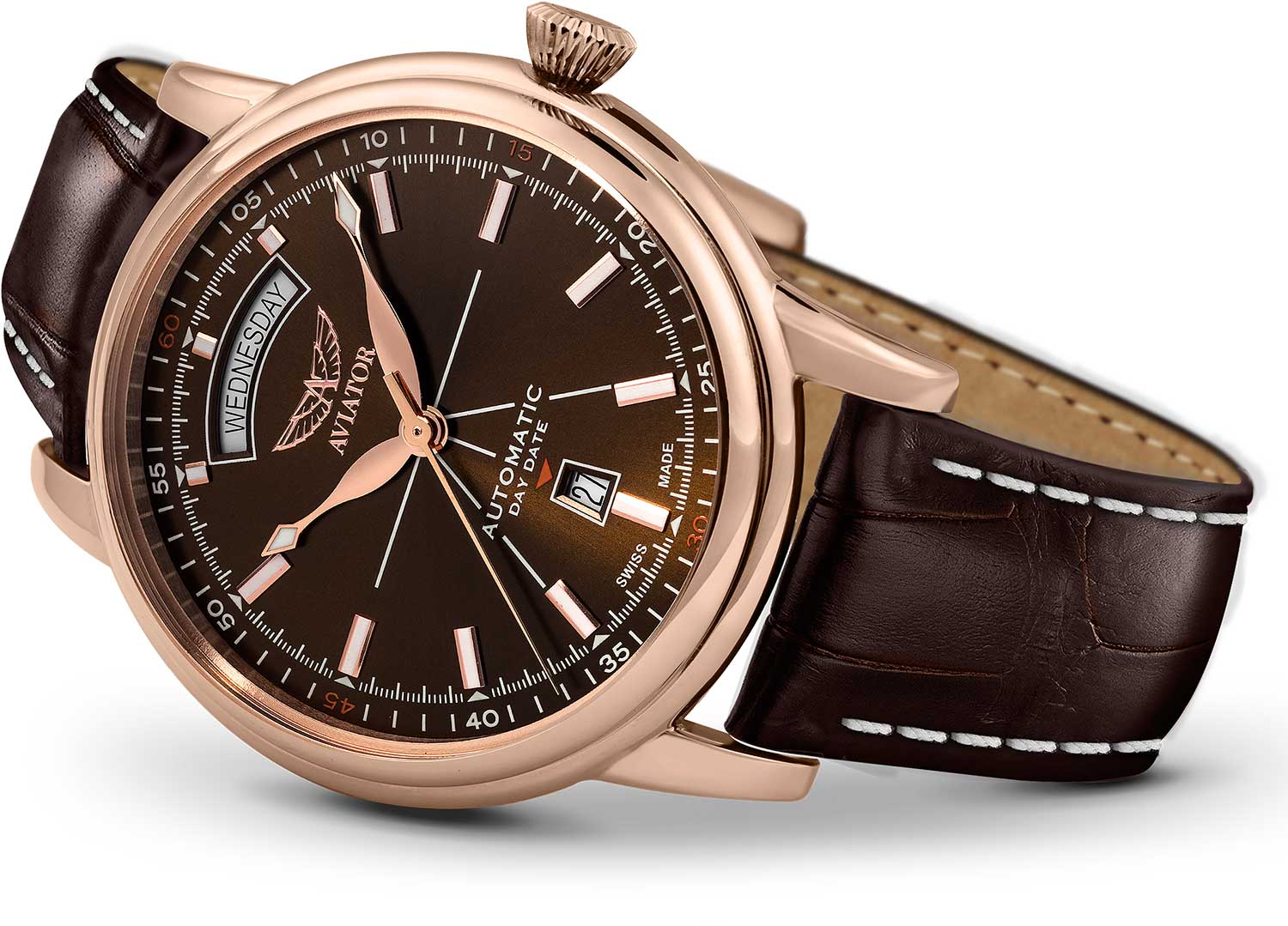 Aviator Douglas Day Date V.3.20.2.226.4 — швейцарские часы в классике авиадизайна, сочетающие безупречную читаемость и высокую надёжность. Корпус диаметром 45 мм выполнен из нержавеющей стали с PVD-покрытиемPVDУльтратонкое покрытие наносится в технике вакуумного напыления, сочетает в себе нитрид титана особой прочности со слоем золота или оксида хрома. Несёт в себе декоративную или защитную функцию. цвета розового золота. Накладные метки выполнены в виде штрихов. Окошко даты находится в положении 6 часов. День недели находится в положении 12 часов. Часовые метки и стрелки покрыты люминесцентным покрытиемЛюминесцентное покрытиеПозволяет считывать показания времени в темноте. Производители наносят на стрелки, часовые индексы, безель или поверхность циферблата светонакопительный состав, дающий холодное свечение. Superluminova, позволяющим легко определять время даже в тёмное время суток. Поверхность защищена прочным сапфировым стекломСапфировое стеклоПрочный и надёжный материал из кристалла сапфира синтетического происхождения, характеризующийся особой твёрдостью и устойчивостью к царапинам и повреждениям. с антибликовым покрытием, устойчивым к царапинам. Сердце модели — швейцарский механизм ETA 2834-2, известный своей точностью и долговечностью. Водозащита 50 метров позволит защитить корпус от случайных брызг или капель дождя. Завинчивающаяся головка и задняя крышка обеспечивают уверенную ударопрочностьУдаропрочный корпусМеханизм заключён в корпус, выполненный из современных материалов, устойчивых к ударам, механическим повреждениям и падению с высоты: инновационный пластик, карбон, нержавеющая сталь, титан. и надёжную защиту от влаги и пыли. В механизме 25 камней, запас хода до 38 часов. Модель дополнена кожаным ремешком с выразительной текстурой и классическим стилем, закреплённым с помощью застёжке-бабочке с кнопкамиЗастёжка "бабочка"Такой вид застёжки дополняется предохранителями, помогающими избежать случайного раскрытия браслета. Обладают изящным исполнением. — для максимального комфорта и лёгкости в повседневном использовании. Aviator — это образец лётной точности, инженерной чёткости и сдержанной роскоши, идеально подходящий для тех, кто ценит функциональность и уверенность в каждом элементе.