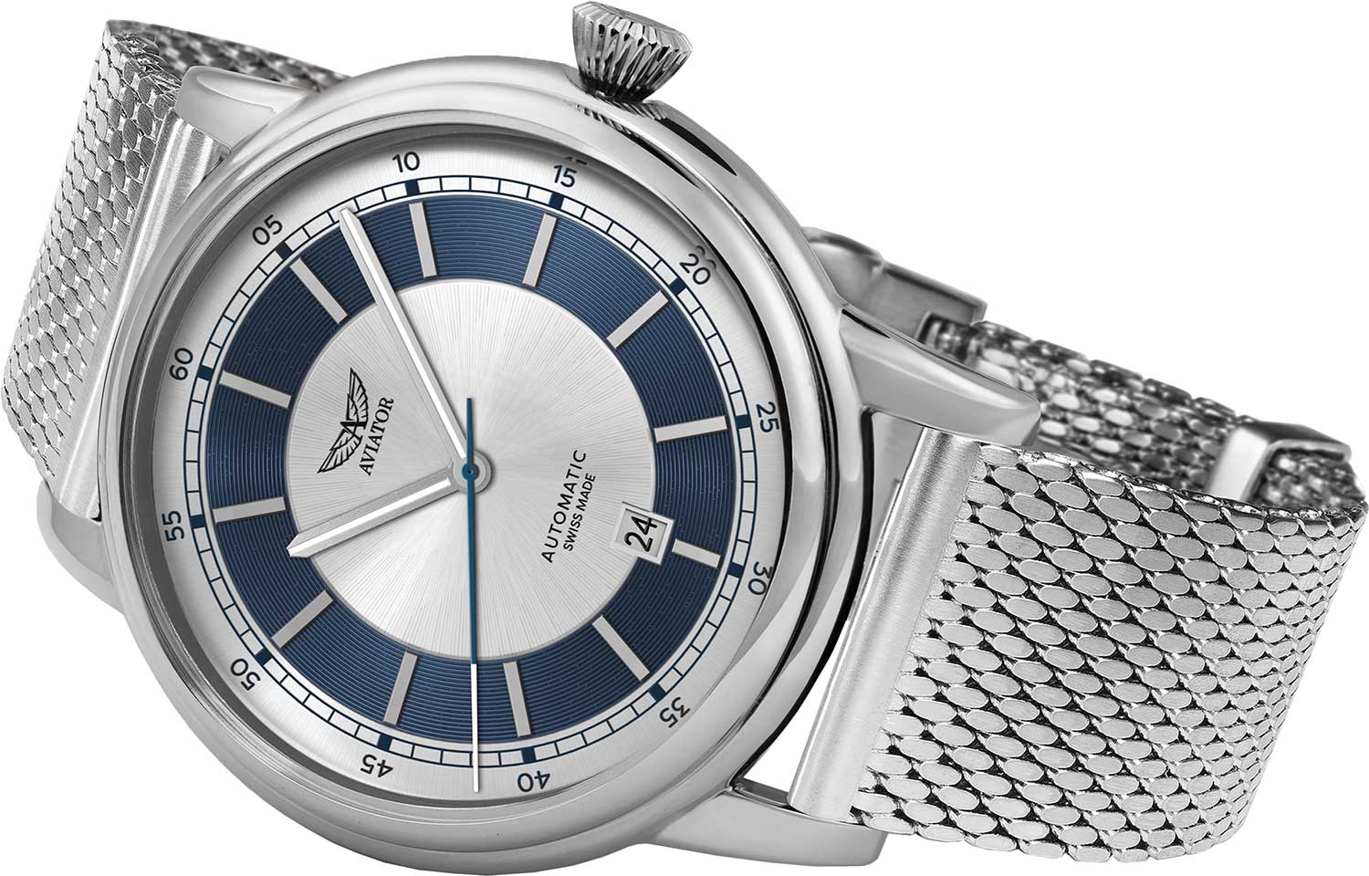 Aviator Douglas DC-3 V.3.32.0.273.5 — швейцарские часы в классике авиадизайна, сочетающие безупречную читаемость и высокую надёжность. Лимитированная серия. Корпус диаметром 45 мм выполнен из нержавеющей стали 316L. Накладные метки выполнены в виде штрихов. Окошко даты находится в положении 6 часов. Часовые метки и стрелки покрыты люминесцентным покрытиемЛюминесцентное покрытиеПозволяет считывать показания времени в темноте. Производители наносят на стрелки, часовые индексы, безель или поверхность циферблата светонакопительный состав, дающий холодное свечение. Superluminova, позволяющим легко определять время даже в тёмное время суток. Поверхность защищена прочным сапфировым стекломСапфировое стеклоПрочный и надёжный материал из кристалла сапфира синтетического происхождения, характеризующийся особой твёрдостью и устойчивостью к царапинам и повреждениям. с антибликовым покрытием, устойчивым к царапинам. Сердце модели — швейцарский механизм Sellita SW 200-1, известный своей точностью и долговечностью. Водозащита 100 метров, позволит плавать, нырять и заниматься другими водными видами спорта. Завинчивающаяся головка и задняя крышка обеспечивают уверенную ударопрочностьУдаропрочный корпусМеханизм заключён в корпус, выполненный из современных материалов, устойчивых к ударам, механическим повреждениям и падению с высоты: инновационный пластик, карбон, нержавеющая сталь, титан. и надёжную защиту от влаги и пыли. В механизме 26 камней, запас хода 38 часов. Модель дополнена стальным браслетом миланского плетения, закреплённым с помощью застёжке-бабочке с кнопкамиЗастёжка "бабочка"Такой вид застёжки дополняется предохранителями, помогающими избежать случайного раскрытия браслета. Обладают изящным исполнением. — для максимального комфорта и лёгкости в повседневном использовании. Циферблат выполнен по технологии sun-ray (солнечные лучи). Коллекция Douglas была разработана в честь известного американского пассажирского самолета Douglas DC-3. Aviator — это образец лётной точности, инженерной чёткости и сдержанной роскоши, идеально подходящий для тех, кто ценит функциональность и уверенность в каждом элементе.