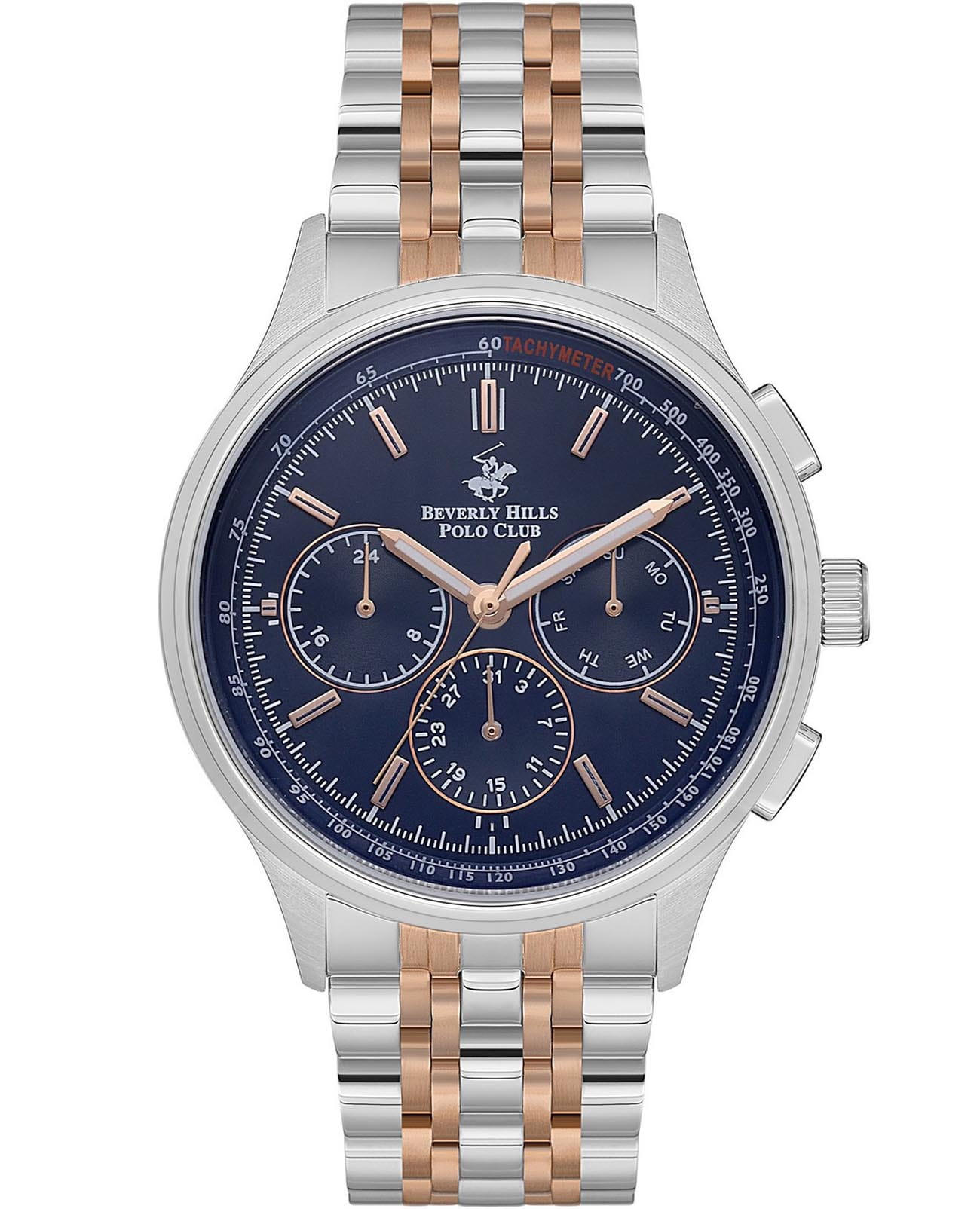 Американские мужские часы Beverly Hills Polo Club BP3556X.590 с надёжным кварцевым механизмом. Минеральное стеклоМинеральное стеклоМинеральное стекло представляет собой искусственно выращенный минерал кварца. Такое стекло отличается особой устойчивостью к повреждениям и царапинам. Уступает по некоторым качествам сапфировому стеклу. устойчивое к появлению царапин, обладающее высокой прозрачностью. Класс водозащиты: 50 метров, позволит защитить корпус от случайных брызг или капель дождя. Корпус часов изготовлен из стали. Стальной браслет с частичным IP-покрытиемIP-покрытиеМетод ионного напыления. Демонстрирует повышенную устойчивость к истиранию, окислению и химическим веществам. Под воздействием высокого давления и температуры около 1500°C молекулы металла надёжно соединяются с частицами корпуса часов. на раскладной застёжкеРаскладная застёжкаТакой тип застёжки используется только на браслетах из металла. Она никогда не раскрывается полностью, происходит разделение на 2 и более частей. Раскладывающая застёжка снизит вероятность потери часов к минимуму.. Стрелки и метки с люминесцентным покрытиемЛюминесцентное покрытиеПозволяет считывать показания времени в темноте. Производители наносят на стрелки, часовые индексы, безель или поверхность циферблата светонакопительный состав, дающий холодное свечение.. Дата, день недели и 24-х часовой формат времени на дополнительных циферблатах. Циферблат со шкалой тахиметраТахиметрРазмеченная шкала, располагается на ободке или безеле часов. Тахиметр позволяет рассчитать скорость на определённом участке пути, расстояние измеряется в километрах или милях..