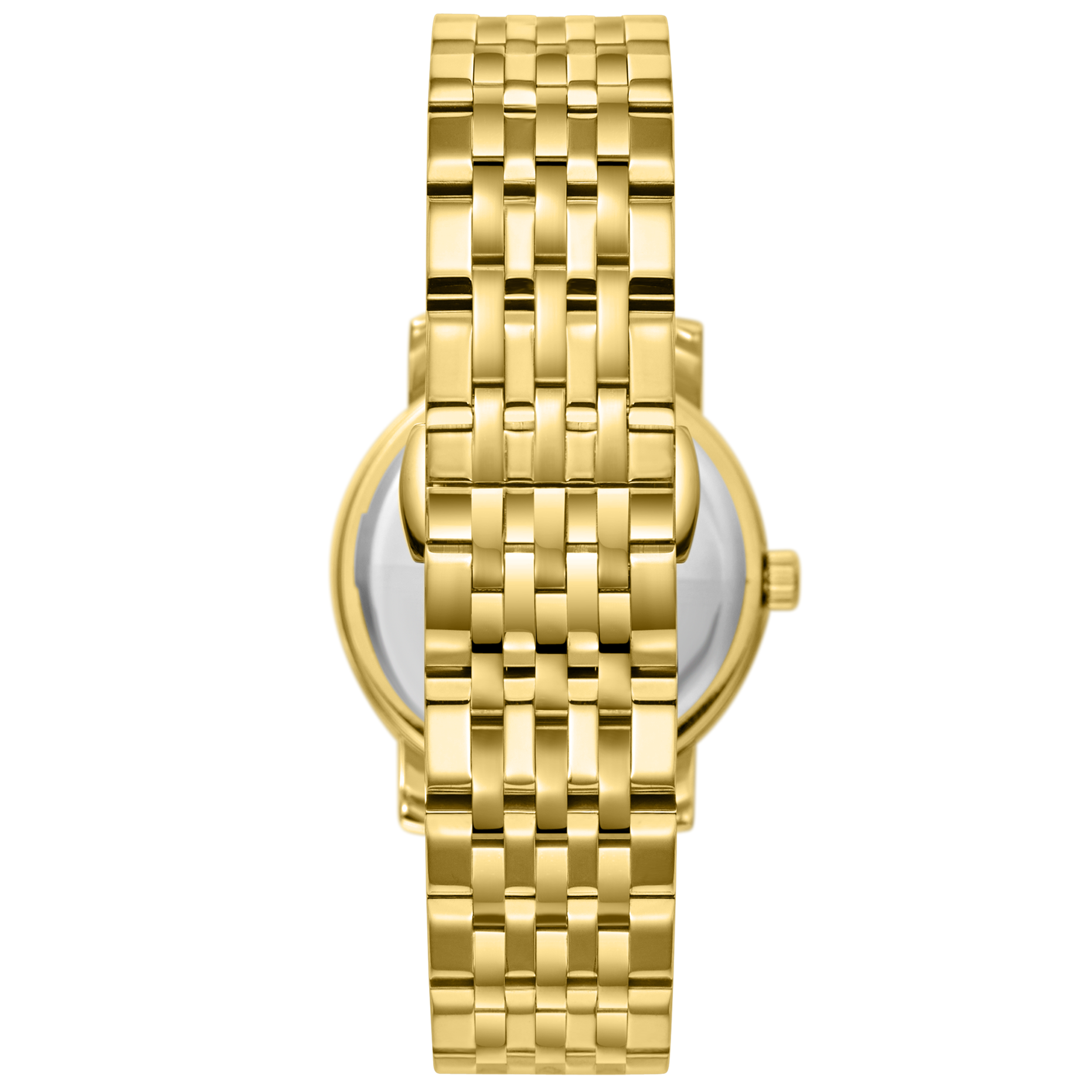 Модель оснащена кварцевым механизмом, обеспечивающим точное измерение времени. Металлический браслет с PVD-покрытиемPVDУльтратонкое покрытие наносится в технике вакуумного напыления, сочетает в себе нитрид титана особой прочности со слоем золота или оксида хрома. Несёт в себе декоративную или защитную функцию. дополнен застёжкой-бабочкойЗастёжка "бабочка"Такой вид застёжки дополняется предохранителями, помогающими избежать случайного раскрытия браслета. Обладают изящным исполнением. , обеспечивающей комфортное ношение и надёжную фиксацию.