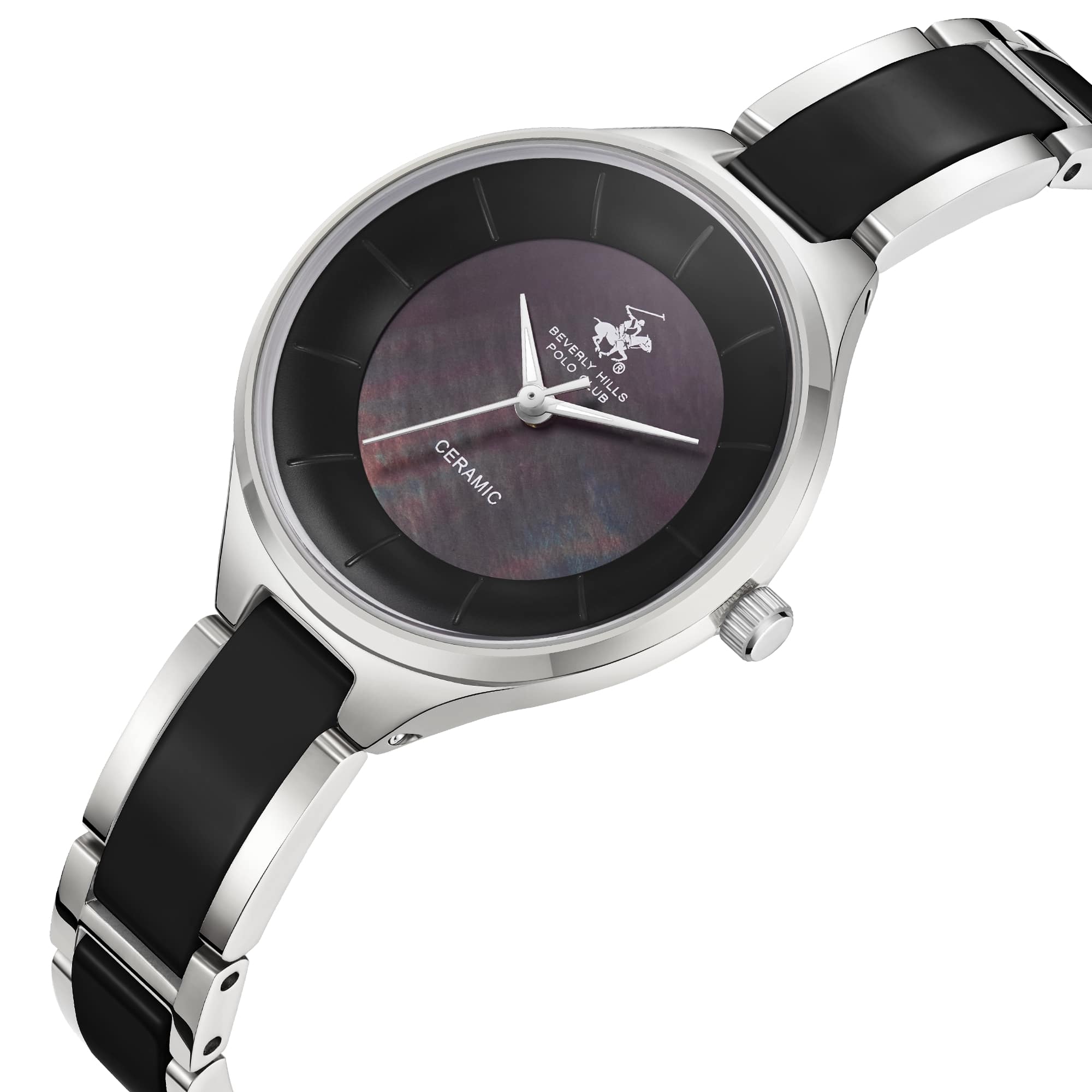 Beverly Hills Polo Club BP3706C.350 – элегантные женские часы, сочетающие современный дизайн и высокое качество. Корпус диаметром 30 мм выполнен из суперметалла, что придаёт модели изысканный и стильный вид. Циферблат защищён минеральным стекломМинеральное стеклоМинеральное стекло представляет собой искусственно выращенный минерал кварца. Такое стекло отличается особой устойчивостью к повреждениям и царапинам. Уступает по некоторым качествам сапфировому стеклу., обеспечивающим устойчивость к царапинам. Часы оснащены точным кварцевым механизмом, гарантирующим надёжное и стабильное отображение времени. Браслет из нержавеющей стали и керамическими вставками оснащён ювелирной застежкой, обеспечивающей комфортное ношение и надёжную фиксацию на запястье. Водозащита до 50 метров (5 ATM) позволяет использовать часы в повседневной жизни, включая мытьё рук и попадание под дождь.