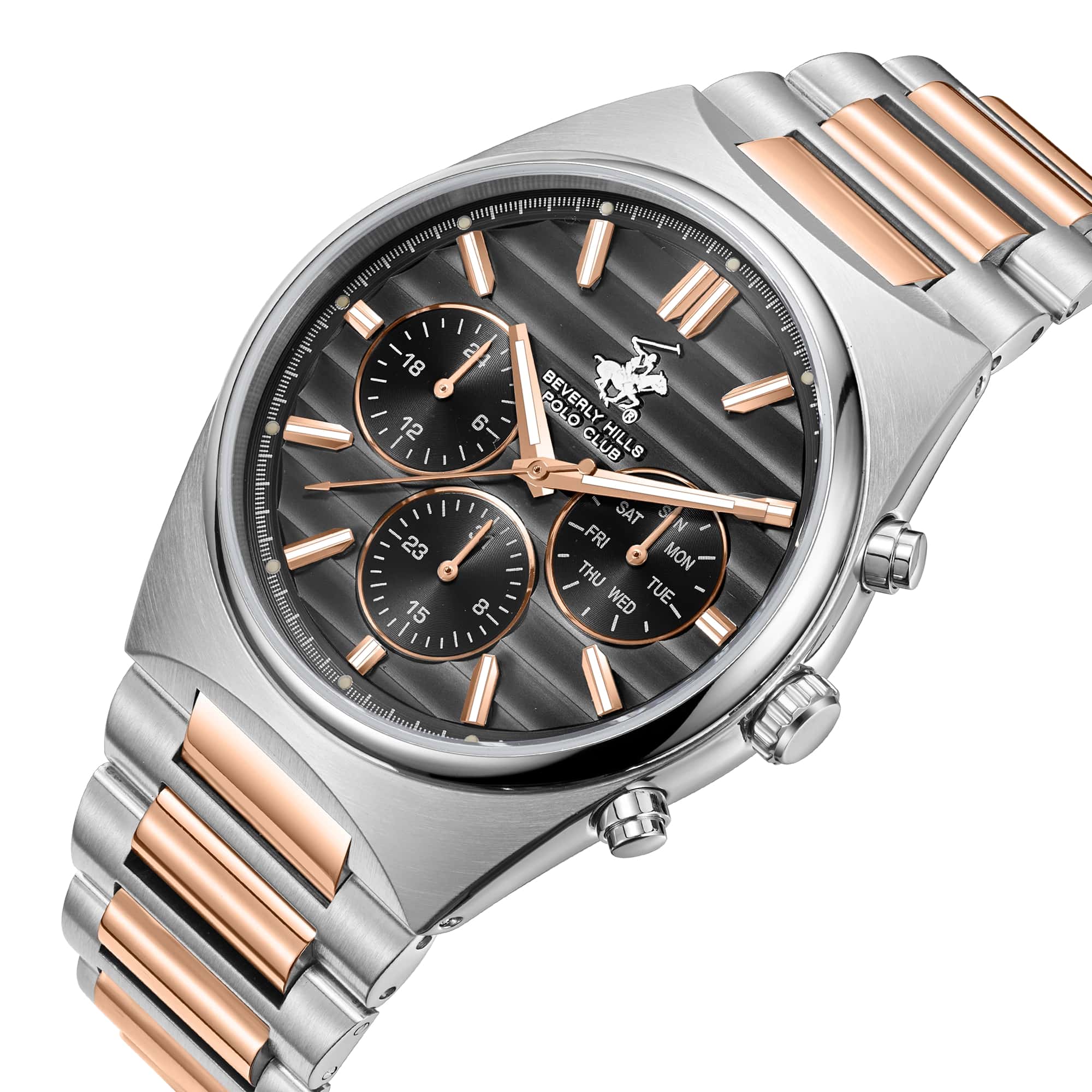 Часы Beverly Hills Polo Club BP3744X.360 — это гармоничное сочетание силы, стиля и современных технологий. Выполненные из высококачественной нержавеющей стали с PVD-покрытиемPVDУльтратонкое покрытие наносится в технике вакуумного напыления, сочетает в себе нитрид титана особой прочности со слоем золота или оксида хрома. Несёт в себе декоративную или защитную функцию., минеральное стеклоМинеральное стеклоМинеральное стекло представляет собой искусственно выращенный минерал кварца. Такое стекло отличается особой устойчивостью к повреждениям и царапинам. Уступает по некоторым качествам сапфировому стеклу., защищающее циферблат, надёжно оберегает его от царапин, сохраняя яркий блеск. С уровнем водозащиты до 100 метров, эти часы готовы сопровождать вас в любых водных приключениях: будь то плавание, ныряние или активные занятия спортом. Стальной браслет с PVD-покрытиемPVDУльтратонкое покрытие наносится в технике вакуумного напыления, сочетает в себе нитрид титана особой прочности со слоем золота или оксида хрома. Несёт в себе декоративную или защитную функцию. на застёжке-бабочке с кнопкамиЗастёжка "бабочка"Такой вид застёжки дополняется предохранителями, помогающими избежать случайного раскрытия браслета. Обладают изящным исполнением. . На циферблате отображается не только текущее время, но и такие полезные функции, как дата, день недели, 24-часовой формат.Стрелки с люминесцентным покрытиемЛюминесцентное покрытиеПозволяет считывать показания времени в темноте. Производители наносят на стрелки, часовые индексы, безель или поверхность циферблата светонакопительный состав, дающий холодное свечение. придают удобство в использовании в темное время суток. Эта модель — истинное воплощение философии Beverly Hills Polo Club: сочетание высоких стандартов качества и неподражаемого стиля, создающее аксессуар, который станет вашим верным компаньоном в повседневной жизни.