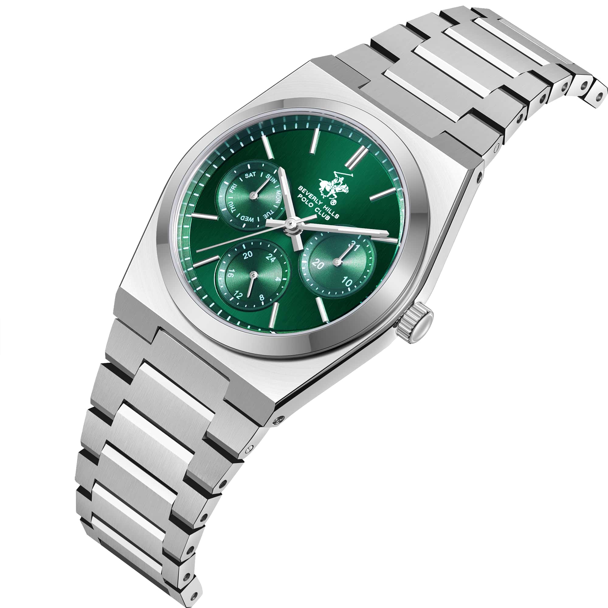 Beverly Hills Polo Club BP3754X.370 – элегантные женские часы, сочетающие стильный дизайн и высокую функциональность. Корпус диаметром 33 мм выполнен из стали, обеспечивающего прочность и долговечность. Циферблат украшен, и защищён минеральным стекломМинеральное стеклоМинеральное стекло представляет собой искусственно выращенный минерал кварца. Такое стекло отличается особой устойчивостью к повреждениям и царапинам. Уступает по некоторым качествам сапфировому стеклу., устойчивым к царапинам. Часы оснащены точным кварцевым механизмом, гарантирующим надёжное отображение времени. Браслет из нержавеющей стали на застёжке-бабочке с кнопкамиЗастёжка "бабочка"Такой вид застёжки дополняется предохранителями, помогающими избежать случайного раскрытия браслета. Обладают изящным исполнением. , обеспечивающей комфортное ношение и надёжную фиксацию на запястье. Водозащита до 50 метров (5 ATM) позволяет использовать часы в повседневной жизни, включая кратковременное погружение в воду.