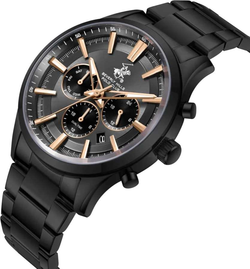 Мужские кварцевые часы Beverly Hills Polo Club — это воплощение лаконичности и эффектного стиля. Корпус диаметром 42 мм выполнен из стали 316L с IP-покрытиемIP-покрытиеМетод ионного напыления. Демонстрирует повышенную устойчивость к истиранию, окислению и химическим веществам. Под воздействием высокого давления и температуры около 1500°C молекулы металла надёжно соединяются с частицами корпуса часов. чёрного цвета. Циферблат чёрного цвета оформлен штрихами, стрелками и тремя вынесенными субциферблатами: для отображения дня недели, даты и 24-часового формата времени. Стрелки с люминесцентным покрытиемЛюминесцентное покрытиеПозволяет считывать показания времени в темноте. Производители наносят на стрелки, часовые индексы, безель или поверхность циферблата светонакопительный состав, дающий холодное свечение., обеспечивающим хорошую читаемость в темноте. Циферблат защищён минеральным стеклом с сапфировым покрытиемСапфировое стеклоПрочный и надёжный материал из кристалла сапфира синтетического происхождения, характеризующийся особой твёрдостью и устойчивостью к царапинам и повреждениям.. Часы оснащены стальным браслетом с IP-покрытиемIP-покрытиеМетод ионного напыления. Демонстрирует повышенную устойчивость к истиранию, окислению и химическим веществам. Под воздействием высокого давления и температуры около 1500°C молекулы металла надёжно соединяются с частицами корпуса часов. на раскладной застёжкеРаскладная застёжкаТакой тип застёжки используется только на браслетах из металла. Она никогда не раскрывается полностью, происходит разделение на 2 и более частей. Раскладывающая застёжка снизит вероятность потери часов к минимуму.. Водонепроницаемость 50 м позволяет использовать часы при мытье рук или в дождь. Идеальный выбор для тех, кто ценит американское качество и универсальный дизайн.