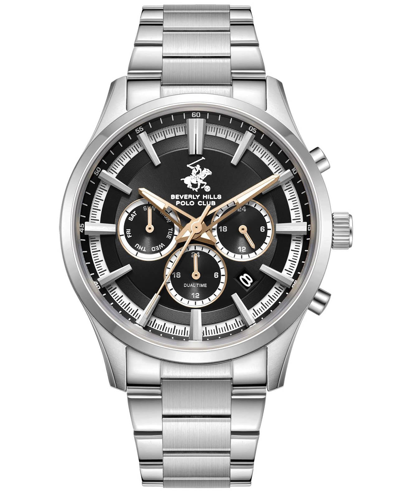 Мужские кварцевые часы Beverly Hills Polo Club — это воплощение лаконичности и эффектного стиля. Корпус диаметром 42 мм выполнен из нержавеющей стали. Циферблат чёрного цвета оформлен штрихами, стрелками и тремя вынесенными субциферблатами: для отображения дня недели, даты и 24-часового формата времени. Стрелки с люминесцентным покрытиемЛюминесцентное покрытиеПозволяет считывать показания времени в темноте. Производители наносят на стрелки, часовые индексы, безель или поверхность циферблата светонакопительный состав, дающий холодное свечение., обеспечивающим хорошую читаемость в темноте. Циферблат защищён минеральным стекломМинеральное стеклоМинеральное стекло представляет собой искусственно выращенный минерал кварца. Такое стекло отличается особой устойчивостью к повреждениям и царапинам. Уступает по некоторым качествам сапфировому стеклу. с сапфировым покрытием. Часы оснащены браслетом из нержавеющей стали на раскладной застёжкеРаскладная застёжкаТакой тип застёжки используется только на браслетах из металла. Она никогда не раскрывается полностью, происходит разделение на 2 и более частей. Раскладывающая застёжка снизит вероятность потери часов к минимуму.. Водонепроницаемость 50 м позволяет использовать часы при мытье рук или в дождь. Идеальный выбор для тех, кто ценит американское качество и универсальный дизайн.
