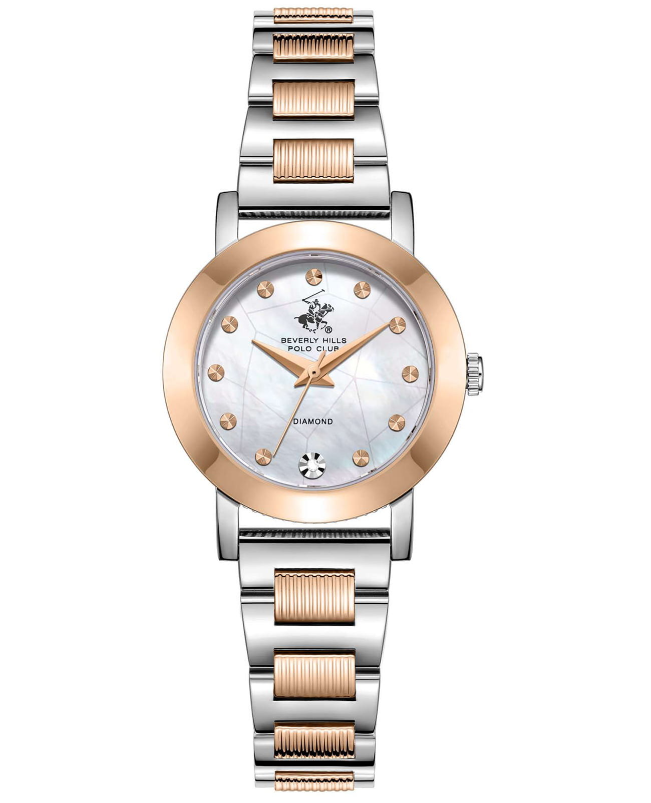 Женские кварцевые часы Beverly Hills Polo Club — это символ безупречного вкуса и роскоши. Корпус диаметром 28 мм выполнен из стали 316L. БезельБезельВнешний ободок, закрепляющий стекло. В спортивных часах так называется поворотное кольцо с делениями на циферблате, выполняет роль таймера – замеряет отрезки времени на шкале. Неподвижный безель – элемент декора. Однонаправленно вращающийся безель на дайверских часах позволяет фиксировать моменты погружения и выныривания на поверхность. с IP-покрытиемIP-покрытиеМетод ионного напыления. Демонстрирует повышенную устойчивость к истиранию, окислению и химическим веществам. Под воздействием высокого давления и температуры около 1500°C молекулы металла надёжно соединяются с частицами корпуса часов.. Циферблат перламутрового цвета оформлен точками, стрелками и инкрустирован одним синтетическим бриллиантом. Циферблат защищён минеральным стекломМинеральное стеклоМинеральное стекло представляет собой искусственно выращенный минерал кварца. Такое стекло отличается особой устойчивостью к повреждениям и царапинам. Уступает по некоторым качествам сапфировому стеклу. с сапфировым покрытием. Часы оснащены стальным браслетом с частичным IP-покрытиемIP-покрытиеМетод ионного напыления. Демонстрирует повышенную устойчивость к истиранию, окислению и химическим веществам. Под воздействием высокого давления и температуры около 1500°C молекулы металла надёжно соединяются с частицами корпуса часов. цвета жёлтого золота на застёжке «бабочка» с кнопкамиЗастёжка "бабочка"Такой вид застёжки дополняется предохранителями, помогающими избежать случайного раскрытия браслета. Обладают изящным исполнением. . Водонепроницаемость 30 м позволяет использовать часы в повседневных условиях. Идеальный выбор для тех, кто ценит американское качество и универсальный дизайн.