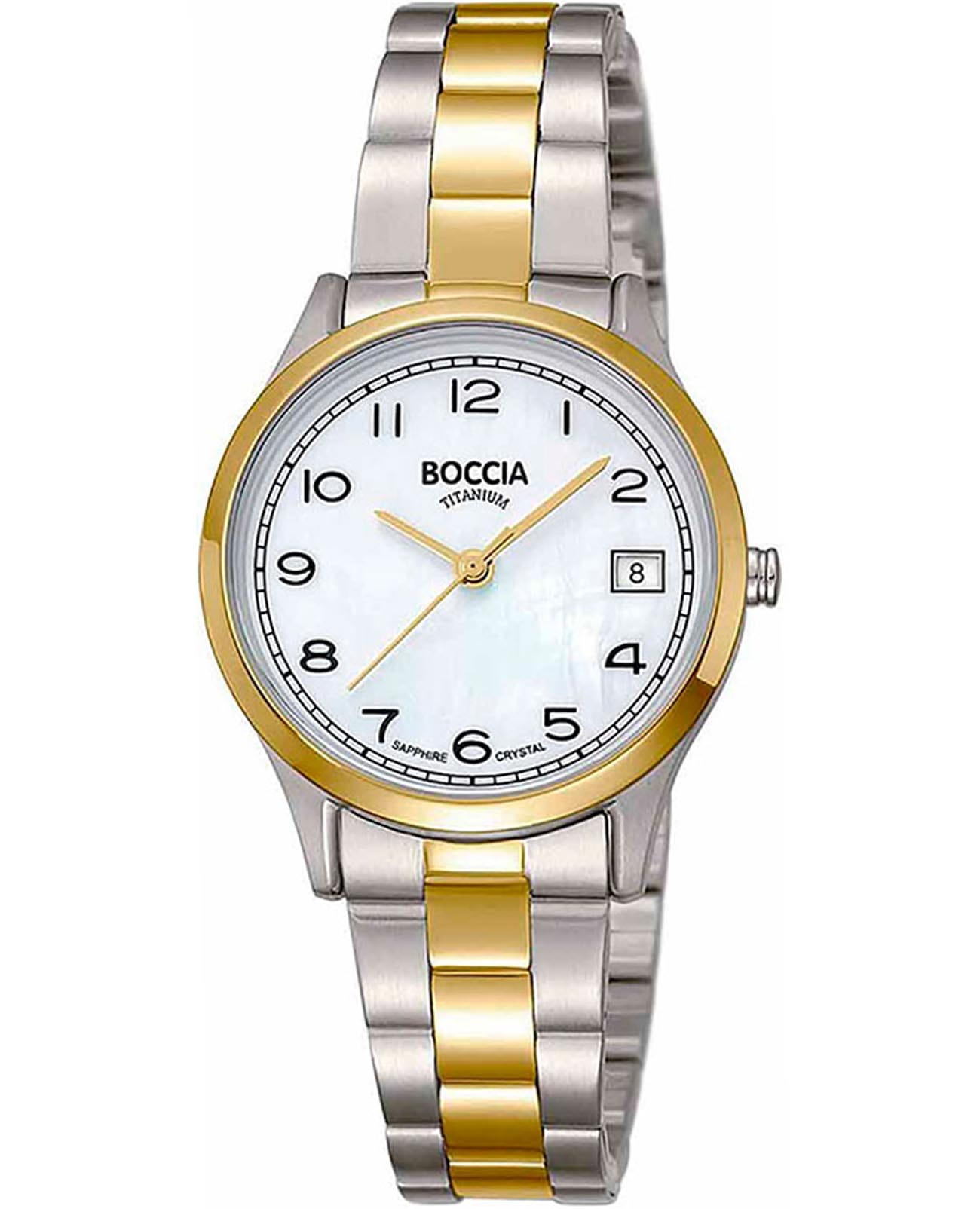 Женские наручные часы Boccia Titanium 3324-02 с надёжным кварцевым механизмом. Корпус и браслет часов изготовлены из титана. Сапфировое стеклоСапфировое стеклоПрочный и надёжный материал из кристалла сапфира синтетического происхождения, характеризующийся особой твёрдостью и устойчивостью к царапинам и повреждениям. устойчивое к мелким механическим повреждениям. Класс водозащиты: 50 метров, позволит защитить корпус от случайных брызг или капель дождя. Титановый браслет с частичным PVD-покрытиемPVDУльтратонкое покрытие наносится в технике вакуумного напыления, сочетает в себе нитрид титана особой прочности со слоем золота или оксида хрома. Несёт в себе декоративную или защитную функцию. на раскладной застёжкеРаскладная застёжкаТакой тип застёжки используется только на браслетах из металла. Она никогда не раскрывается полностью, происходит разделение на 2 и более частей. Раскладывающая застёжка снизит вероятность потери часов к минимуму.. Окошко даты находится в положении 3 часа.