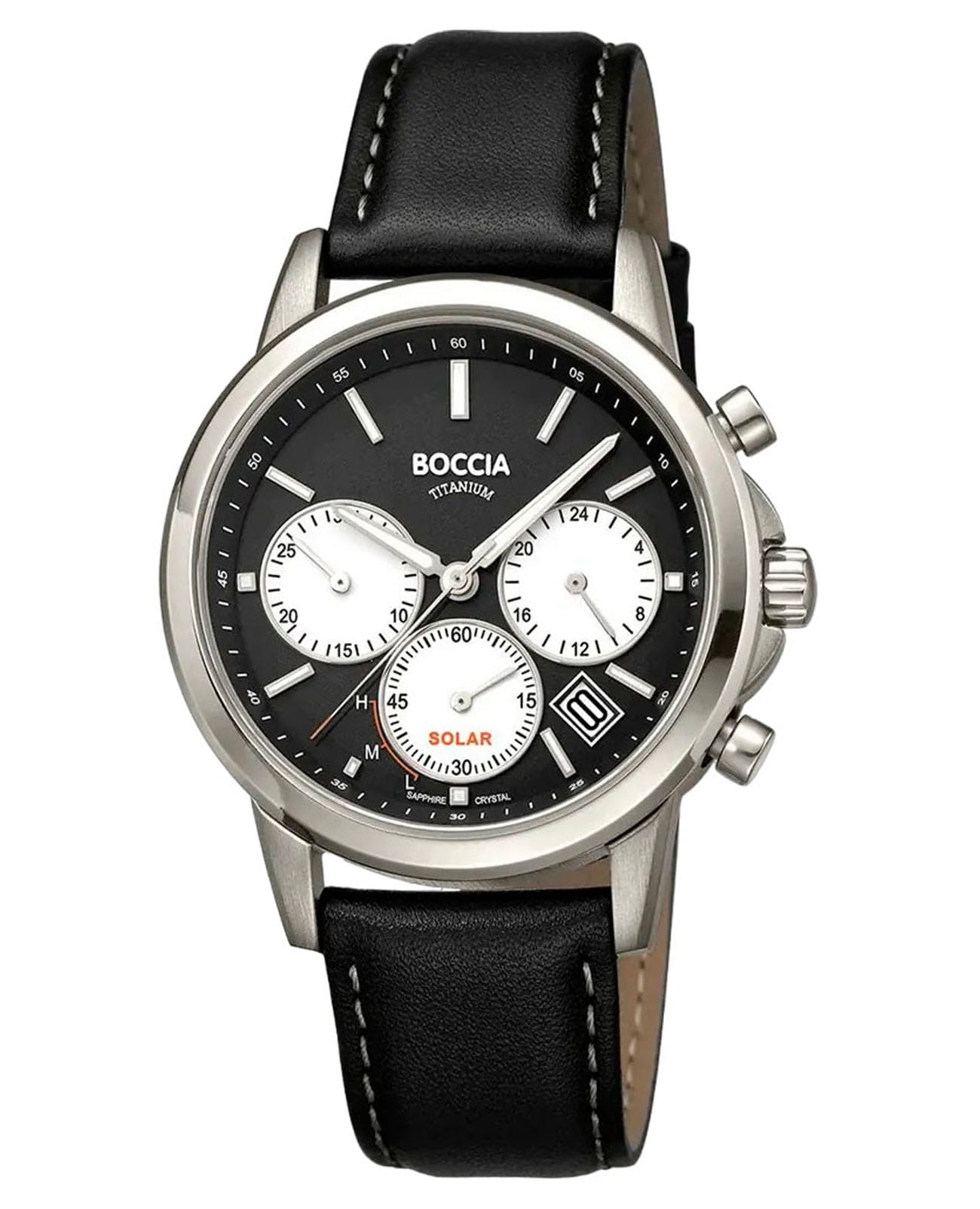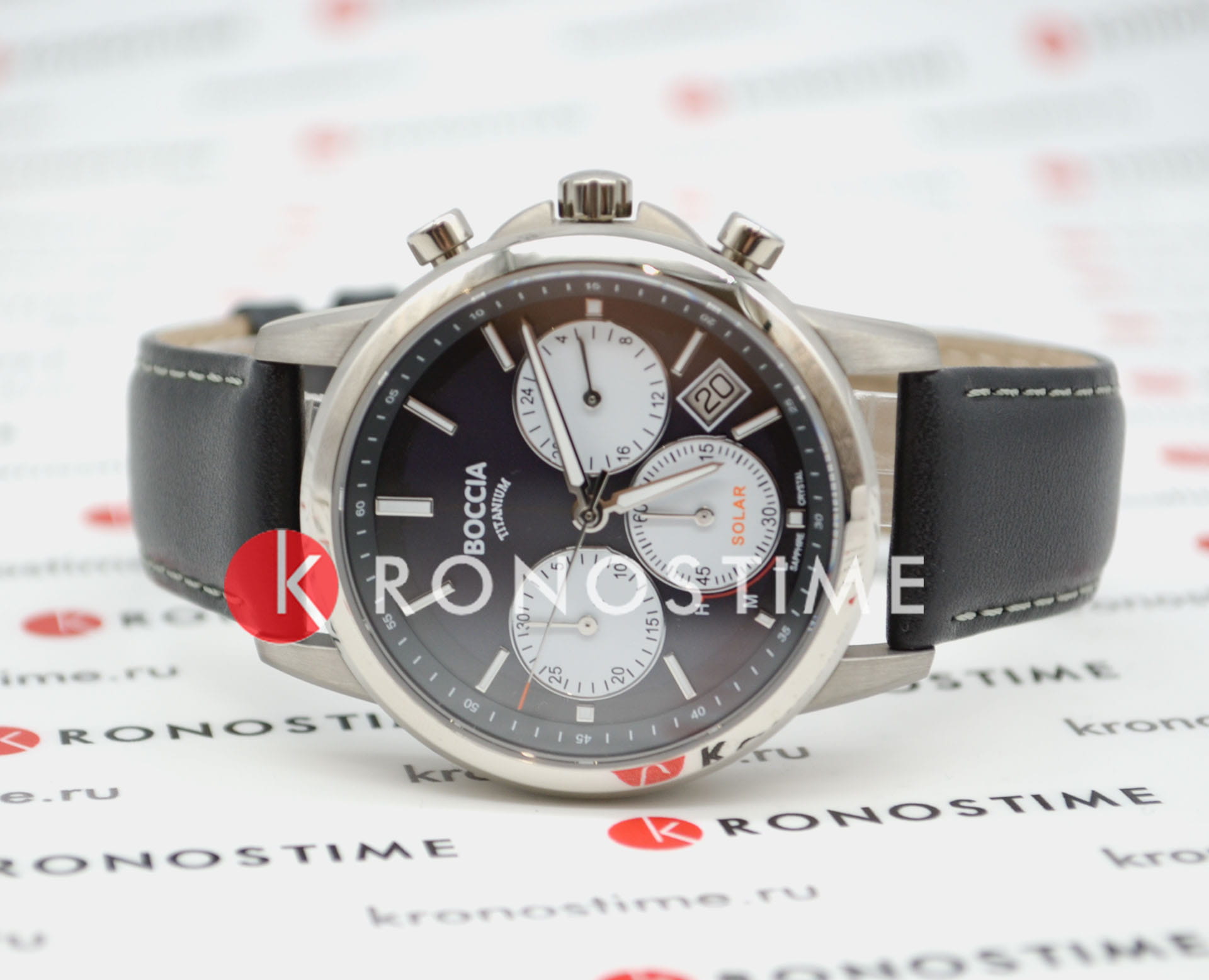 Мужские немецкие титановые часы-хронографХронографФункция позволяет измерять отрезки времени с особой точностью: часы, минуты, секунды. Верным признаком хронографа является наличие на циферблате 3 дополнительных окошек-счётчиков. с секундомеромСекундомерСекундоме́р — прибор, способный измерять интервалы времени с точностью до долей секунды. Boccia Titanium Circle-Oval 3742-01, кварцевый механизм с высокой точностью. Сапфировое стеклоСапфировое стеклоПрочный и надёжный материал из кристалла сапфира синтетического происхождения, характеризующийся особой твёрдостью и устойчивостью к царапинам и повреждениям. устойчивое к появлению царапин, обладающее высокой прозрачностью. Корпус изготовлен из титана. На цифрблате расположены три дополнительных индикатора и окошко даты. Стрелки с люминесцентным покрытиемЛюминесцентное покрытиеПозволяет считывать показания времени в темноте. Производители наносят на стрелки, часовые индексы, безель или поверхность циферблата светонакопительный состав, дающий холодное свечение.. Питание от солнечной энергии. 12-ти и 24-х часовой формат времени. Класс водозащиты: 100 метров, позволит плавать, нырять и заниматься другими водными видами спорта. Кожаный браслет на стандартной застежке.