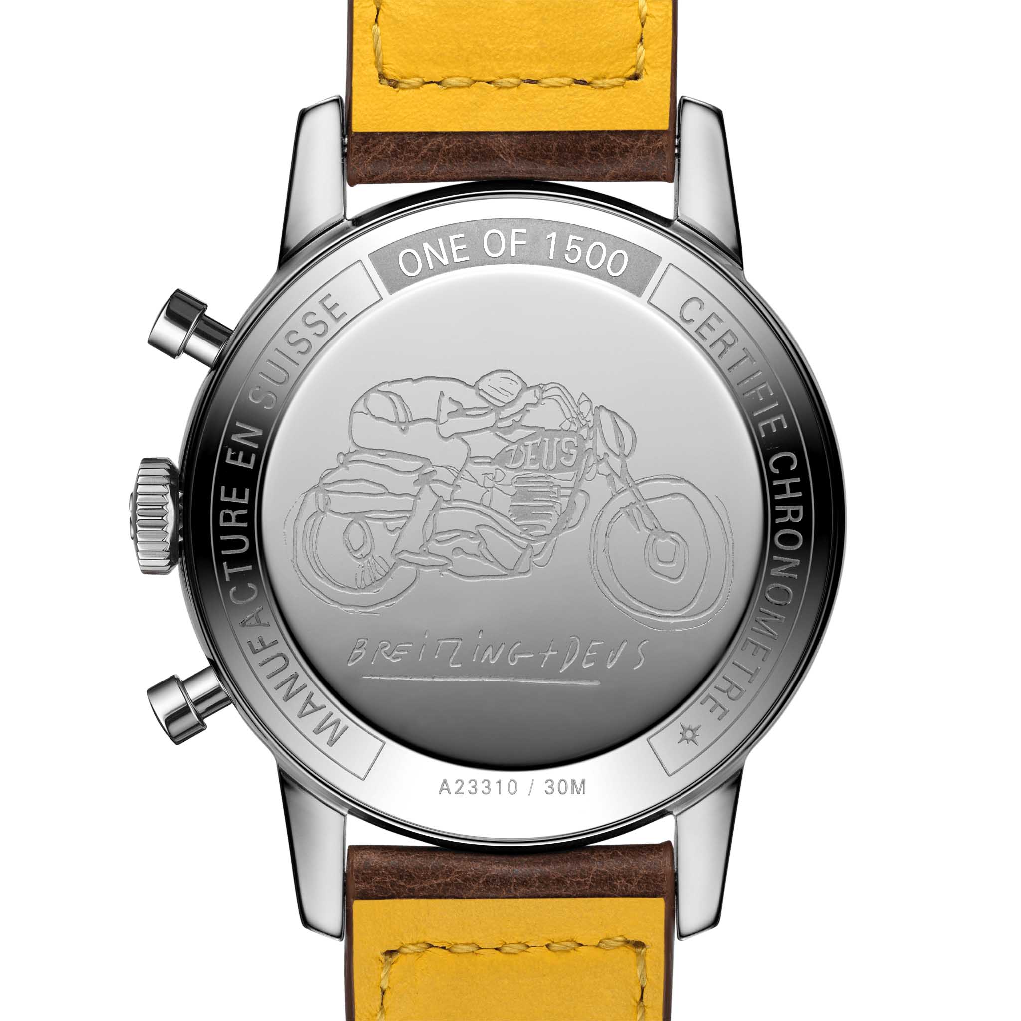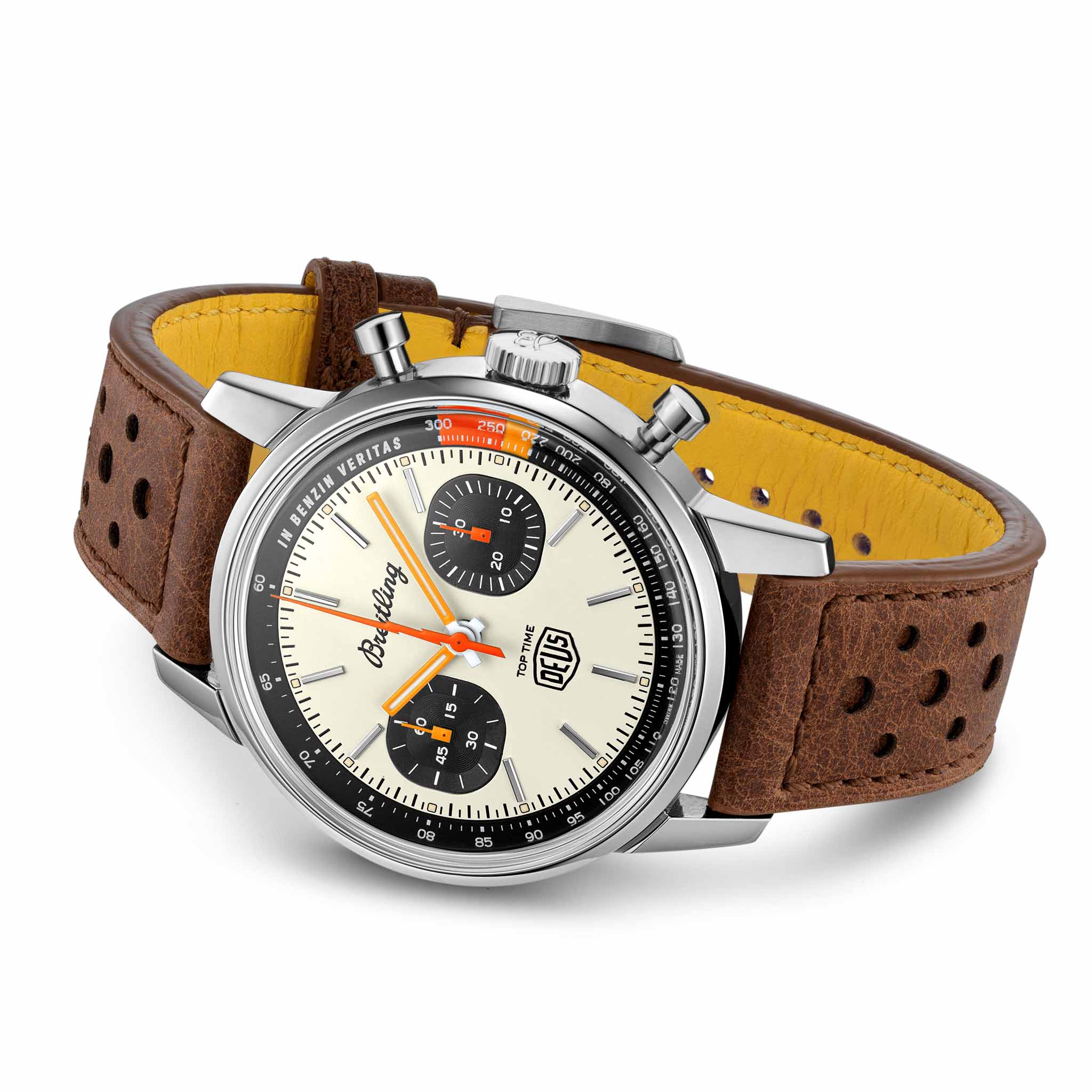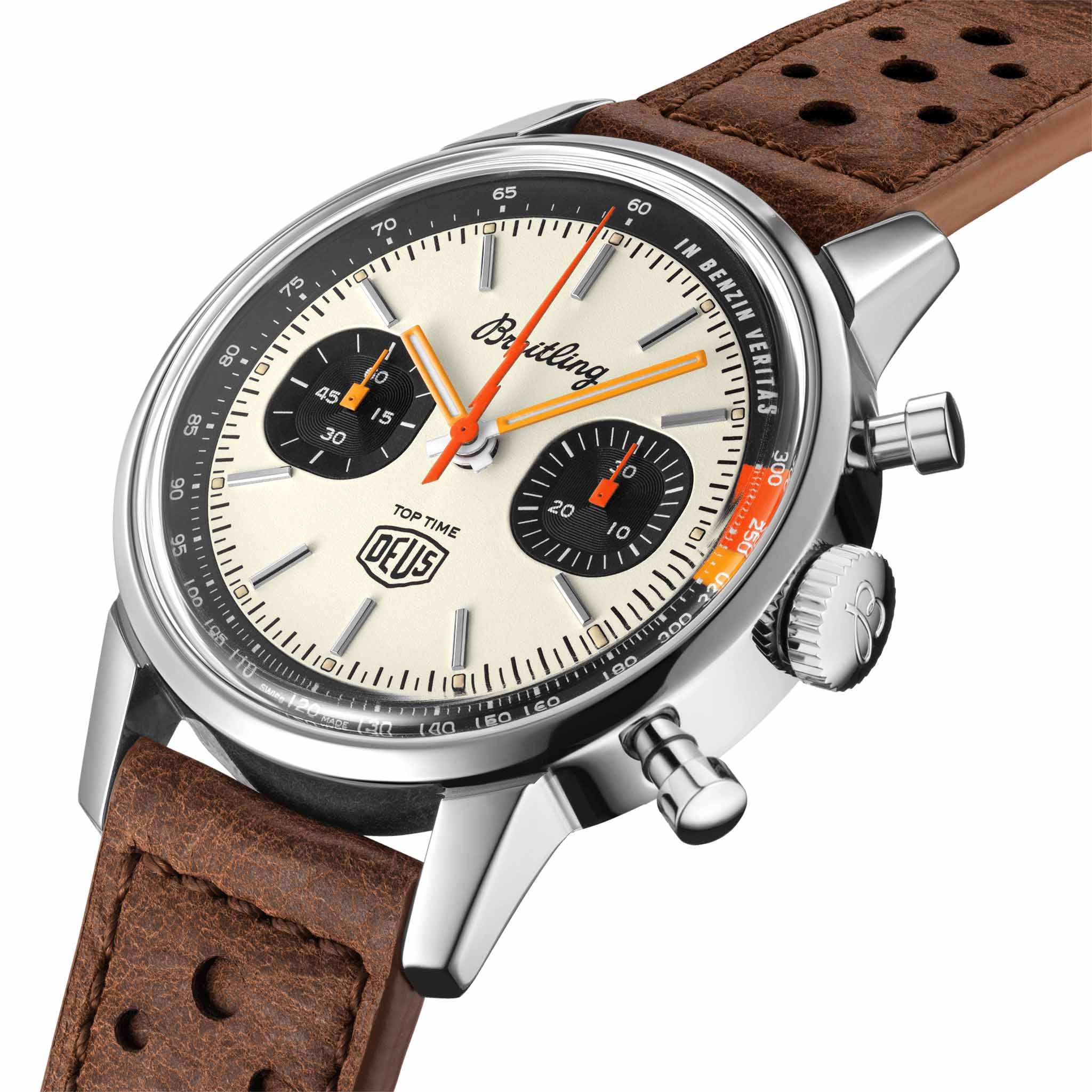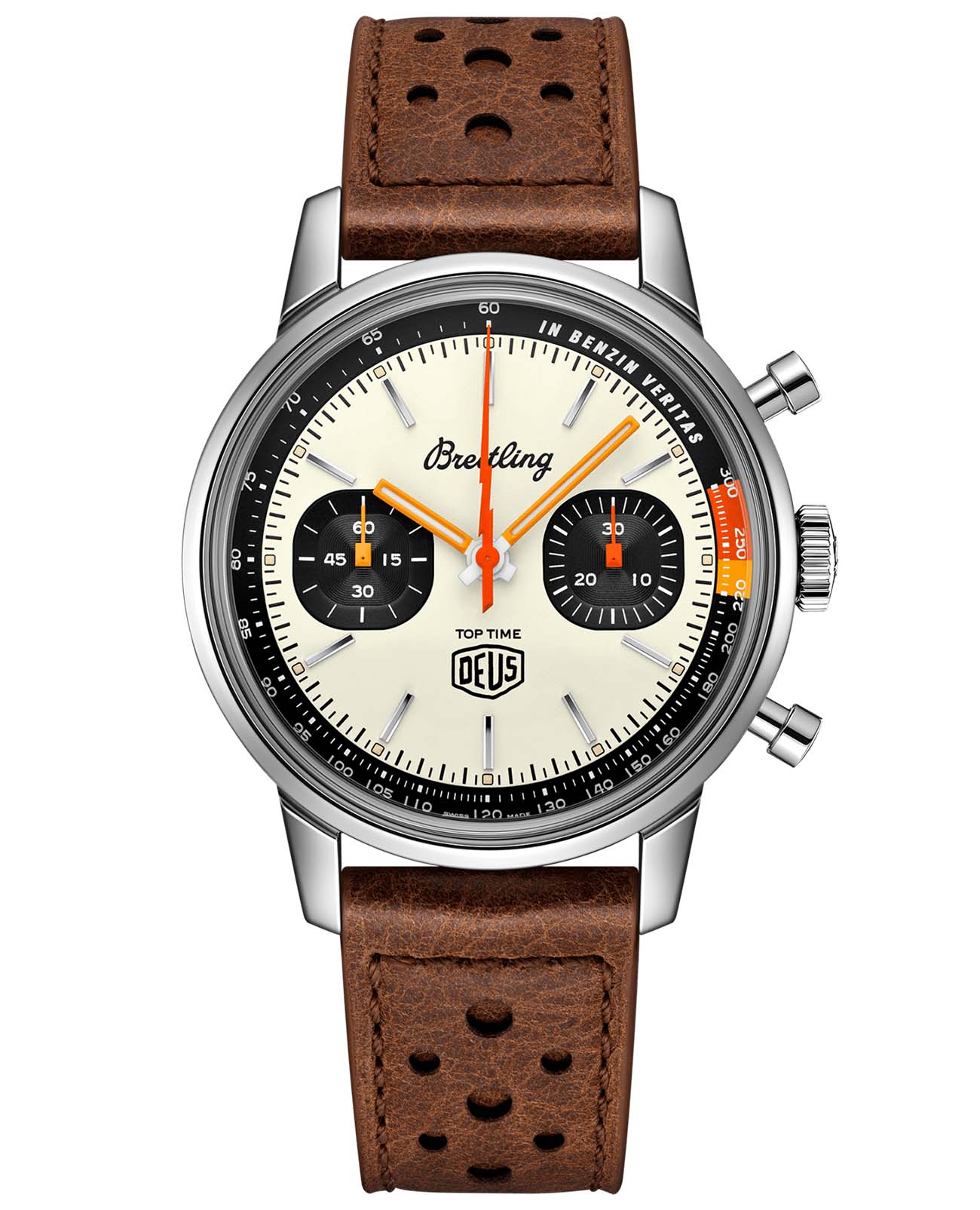 Часы Top Time Deus, созданные в сотрудничестве с модным австралийским брендом индивидуальной экипировки для мотоциклистов и серфингистов Deus Ex Machina (Бог из машины), напоминают оригинальную модель Breitling 1960-х годов, которая передает искреннее восхищение духом кочевников. Top Time Deus несомненно станут верным спутником для байкеров, сноубордистов или туристов, ведь всех их объединяет стремление к свободе и желание покорять мир по-своему и в своем темпе. В модели Top Time Deus с корпусом из нержавеющей стали диаметром 41 мм и искусно подобранным к нему коричневым ремешком из телячьей кожи для поклонников гонок отчетливо выделяются желтые и оранжевые элементы, стрелка хронографа в виде молнии поверх счетчиков хронографа, слоган Deus «In benzin veritas» (Истина в бензине) и фигура мотогонщика в стиле ретро – от креативного директора Deus Карби Таквелла – выгравированы на задней крышке корпуса. «Сердцем» часов Top Time, выпущенных в количестве всего 1500 экземпляров, является механизм Breitling Caliber 23, сертифицированный Швейцарским институтом официального тестирования хронометров (COSC).