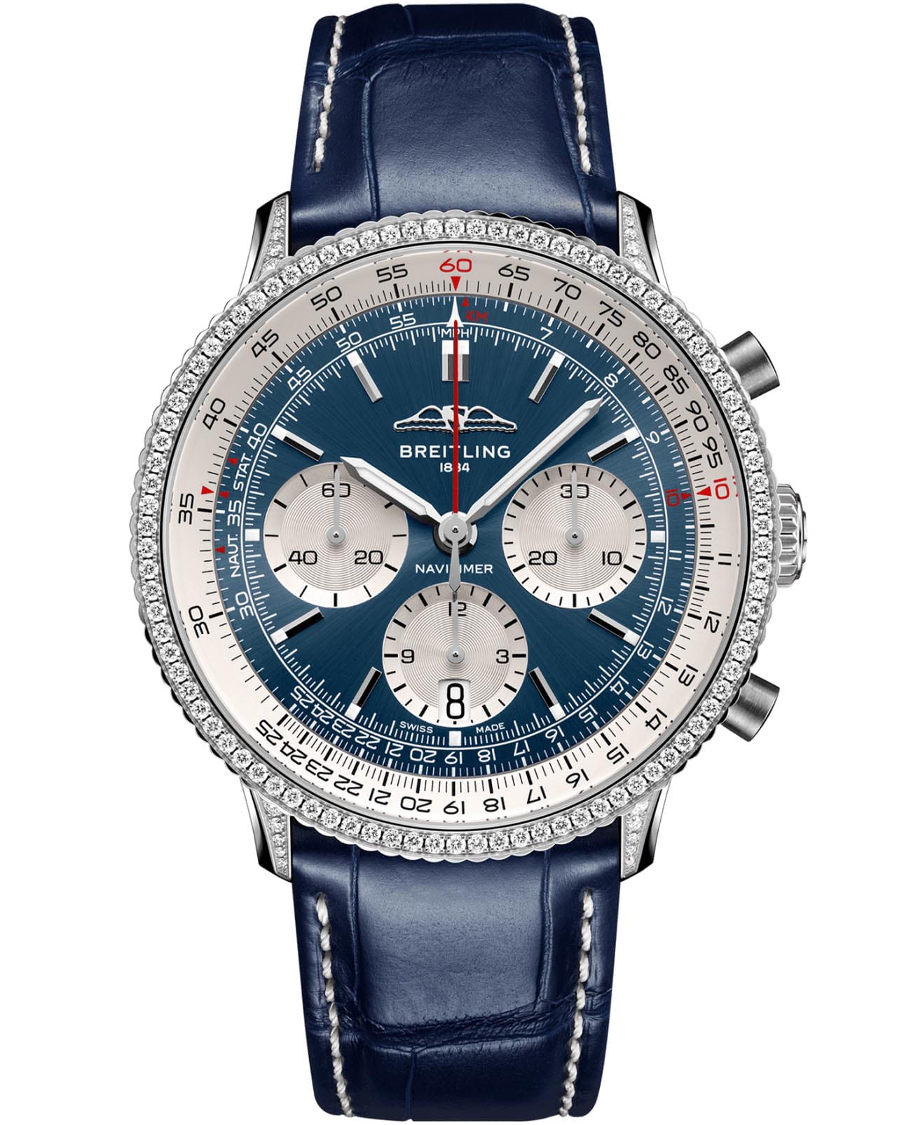 Мужские швейцарские часы-хронографХронографФункция позволяет измерять отрезки времени с особой точностью: часы, минуты, секунды. Верным признаком хронографа является наличие на циферблате 3 дополнительных окошек-счётчиков. с секундомеромСекундомерСекундоме́р — прибор, способный измерять интервалы времени с точностью до долей секунды. Breitling Navitimer B01 Chronograph 41 AB0139631C1P1, механический механизм (автоматический калибр) с высокой точностью. С момента своего дебюта 70 лет назад icon от Breitling претерпел множество модификаций, но этот новый Navitimer отражает его самые классические функции, дополняя их современными усовершенствованиями. Сплющенная логарифмическая линейка и выпуклый кристалл создают иллюзию более изящного профиля. Сапфировое стеклоСапфировое стеклоПрочный и надёжный материал из кристалла сапфира синтетического происхождения, характеризующийся особой твёрдостью и устойчивостью к царапинам и повреждениям. устойчивое к появлению царапин, обладающее высокой прозрачностью. Класс водозащиты: 30 метров, позволит защитить корпус от случайных брызг или капель дождя. Корпус часов изготовлен из стали. Ремешок из кожи аллигатора на стандартной застёжке. Шкала тахиметраТахиметрРазмеченная шкала, располагается на ободке или безеле часов. Тахиметр позволяет рассчитать скорость на определённом участке пути, расстояние измеряется в километрах или милях. на циферблате. БезельБезельВнешний ободок, закрепляющий стекло. В спортивных часах так называется поворотное кольцо с делениями на циферблате, выполняет роль таймера – замеряет отрезки времени на шкале. Неподвижный безель – элемент декора. Однонаправленно вращающийся безель на дайверских часах позволяет фиксировать моменты погружения и выныривания на поверхность. инкрустирован кристаллами. Часы имеют сертификат COSCСертификат COSCОфициальный сертификат, подтверждающий то, что часы ходят с особо высокой точностью. Для получения документа часы подвергаются тестовым испытаниям, разработанным швейцарским институтом тестирования хронометров COSC. Допустимая норма для механических часов -4/+6 секунд в день, для кварцевых моделей +/- 0,07 секунд в день.. Окошко даты находится в положении 6 часов. Часы оснащены логарифмической линейкой. Стрелки и метки с люминесцентным покрытиемЛюминесцентное покрытиеПозволяет считывать показания времени в темноте. Производители наносят на стрелки, часовые индексы, безель или поверхность циферблата светонакопительный состав, дающий холодное свечение.. И если есть одно обновление, которое наверняка вызовет ностальгию, так это возвращение крыльев AOPA в исходное положение на 12 часов. Вот уже 70 лет оригинальные часы Breitling pilot в равной степени нравятся как авиаторам, так и ценителям вкуса. Это самые культовые часы Breitling, которые носят астронавты в космосе и крупнейшие звезды на земле, и одни из самых узнаваемых часов всех времен.