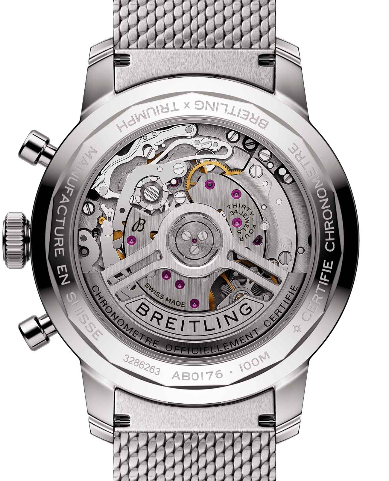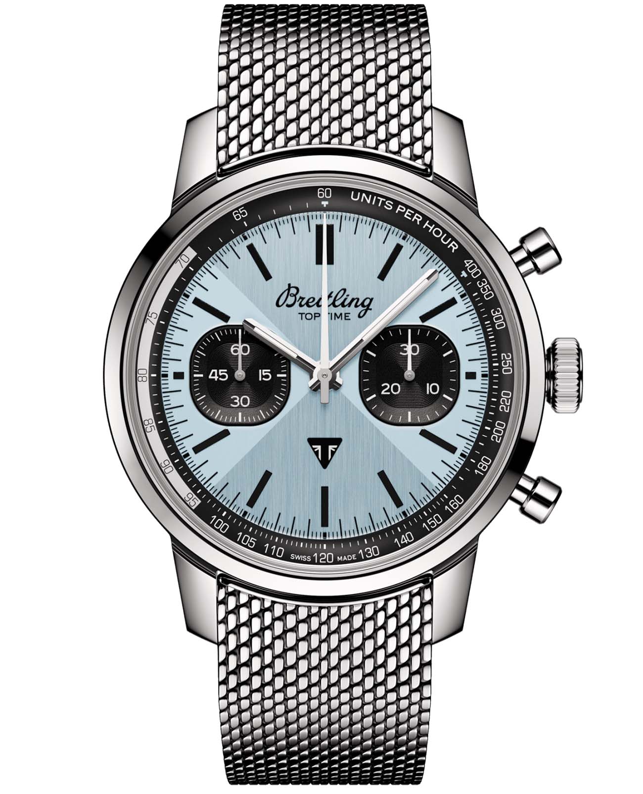 Мужские швейцарские часы-хронографХронографФункция позволяет измерять отрезки времени с особой точностью: часы, минуты, секунды. Верным признаком хронографа является наличие на циферблате 3 дополнительных окошек-счётчиков. с тахиметромТахиметрРазмеченная шкала, располагается на ободке или безеле часов. Тахиметр позволяет рассчитать скорость на определённом участке пути, расстояние измеряется в километрах или милях. Breitling Top Time B01 Triumph AB01764A1C1A1, механический механизм (автоматический калибр) с высокой точностью. Сапфировое стеклоСапфировое стеклоПрочный и надёжный материал из кристалла сапфира синтетического происхождения, характеризующийся особой твёрдостью и устойчивостью к царапинам и повреждениям. устойчивое к появлению царапин, обладающее высокой прозрачностью. Корпус часов изготовлен из нержавеющей стали. Стальной браслет миланского плетения и застёжка «бабочка» с кнопкамиЗастёжка "бабочка"Такой вид застёжки дополняется предохранителями, помогающими избежать случайного раскрытия браслета. Обладают изящным исполнением. . Класс водозащиты: 100 метров, позволит плавать, нырять и заниматься другими водными видами спорта. Стрелки и метки с люминесцентным покрытиемЛюминесцентное покрытиеПозволяет считывать показания времени в темноте. Производители наносят на стрелки, часовые индексы, безель или поверхность циферблата светонакопительный состав, дающий холодное свечение..