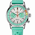 Breitling Top Time B01 Fausto Coppi AB01768A1A1X1 — лимитированные часы, вдохновлённые легендой велоспорта Фаусто Коппи и эстетикой ретро-хронографов 60-х годов. Корпус диаметром 41 мм выполнен из нержавеющей стали с комбинированной сатинированной и полированной отделкой. Прозрачная задняя крышка с гравировкой «Fausto Coppi Tribute» и «One of 750» подчёркивает уникальность выпуска. Циферблат защищён сапфировым стекломСапфировое стеклоПрочный и надёжный материал из кристалла сапфира синтетического происхождения, характеризующийся особой твёрдостью и устойчивостью к царапинам и повреждениям. с антибликовым покрытиемАнтибликовое покрытиеСлой оксида металла в 0,13-0,3 микрон, благодаря которому стекло часов не бликует и не отражает свет. Антибликовое покрытие уменьшает отражение света в 10 раз, обеспечивая отличную читаемость показателей циферблата.. Белый матовый циферблат украшен бирюзовыми субциферблатами и надписью «Il Campionissimo» по внешнему кругу. Подпись Fausto Coppi расположена на отметке 6 часов. Внутри установлен швейцарский автоматический калибр COSC-сертифицированныйСертификат COSCОфициальный сертификат, подтверждающий то, что часы ходят с особо высокой точностью. Для получения документа часы подвергаются тестовым испытаниям, разработанным швейцарским институтом тестирования хронометров COSC. Допустимая норма для механических часов -4/+6 секунд в день, для кварцевых моделей +/- 0,07 секунд в день. хронографХронографФункция позволяет измерять отрезки времени с особой точностью: часы, минуты, секунды. Верным признаком хронографа является наличие на циферблате 3 дополнительных окошек-счётчиков. Breitling B01, обеспечивающий точность, стабильность и запас хода до 70 часов. Модель укомплектована перфорированным кожаным ремешком бирюзового цвета, гармонирующим с деталями циферблата, и раскладной застёжкойРаскладная застёжкаТакой тип застёжки используется только на браслетах из металла. Она никогда не раскрывается полностью, происходит разделение на 2 и более частей. Раскладывающая застёжка снизит вероятность потери часов к минимуму.. Водонепроницаемость 100 метров делает часы надёжными не только в городе, но и в активной среде. Эта лимитированная модель — признание в любви к велоспорту и винтажной эстетике.