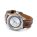 Класс водозащиты: 100 метров, позволит плавать, нырять и заниматься другими водными видами спорта. Корпус часов серебристого цвета, изготовлен из нержавеющей стали. Ремешок из кожи аллигатора коричневого цвета со складной клипсой. Задняя крышка корпуса модели прозрачная и выполнена из сапфирового стекла.