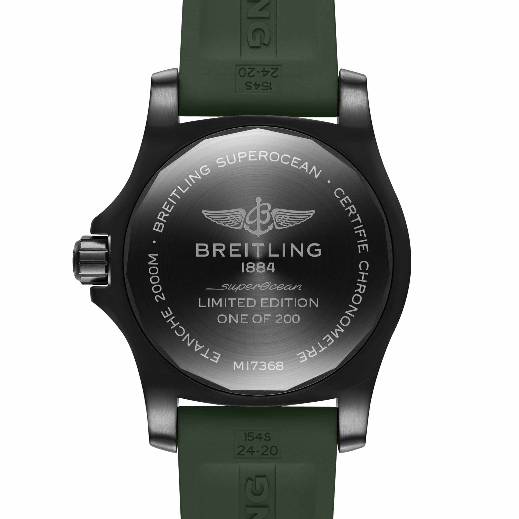 Лимитированные мужские водонепроницаемые швейцарские часы c углеродным покрытием Breitling Superocean Automatic 46 Black Steel M173681A1L1S1, механический механизм (автоматический калибр) с высокой точностью. Сапфировое стеклоСапфировое стеклоПрочный и надёжный материал из кристалла сапфира синтетического происхождения, характеризующийся особой твёрдостью и устойчивостью к царапинам и повреждениям. устойчивое к появлению царапин, обладающее высокой прозрачностью. Класс водозащиты: 2000 метров, позволит плавать, нырять и заниматься другими водными видами спорта. Корпус часов изготовлен из стали с DLC-покрытиемDLC-покрытиеDiamond like carbon - одно из лучших видов покрытия, представляющее собой углерод с алмазными свойствами. На поверхность материала наносятся распавшиеся молекулы углерода, превращающиеся в плёнку из алмазоподобных связей, которая перенимает твёрдость алмаза.. Силиконовый ремешок с раскладной застёжкойРаскладная застёжкаТакой тип застёжки используется только на браслетах из металла. Она никогда не раскрывается полностью, происходит разделение на 2 и более частей. Раскладывающая застёжка снизит вероятность потери часов к минимуму.. Стрелки и метки с люминесцентным покрытиемЛюминесцентное покрытиеПозволяет считывать показания времени в темноте. Производители наносят на стрелки, часовые индексы, безель или поверхность циферблата светонакопительный состав, дающий холодное свечение.. Широкие стрелки и индексы с люминесцентным покрытиемЛюминесцентное покрытиеПозволяет считывать показания времени в темноте. Производители наносят на стрелки, часовые индексы, безель или поверхность циферблата светонакопительный состав, дающий холодное свечение. обеспечивают легкую читаемость под водой. Вращающийся стальной безельБезельВнешний ободок, закрепляющий стекло. В спортивных часах так называется поворотное кольцо с делениями на циферблате, выполняет роль таймера – замеряет отрезки времени на шкале. Неподвижный безель – элемент декора. Однонаправленно вращающийся безель на дайверских часах позволяет фиксировать моменты погружения и выныривания на поверхность. с люминесцентным покрытиемЛюминесцентное покрытиеПозволяет считывать показания времени в темноте. Производители наносят на стрелки, часовые индексы, безель или поверхность циферблата светонакопительный состав, дающий холодное свечение. Superluminova из нержавеющей стали и керамики, защищенный от царапин, никогда не изнашивается и не выцветает. Смелый Superocean Automatic 46 не только готов к испытаниям на морских глубинах (до 200 бар / 2000 метров), но и привлечет тех, чьи приключения происходят немного ближе к берегу. Это издание ограничено тиражом в 200 экземпляров.