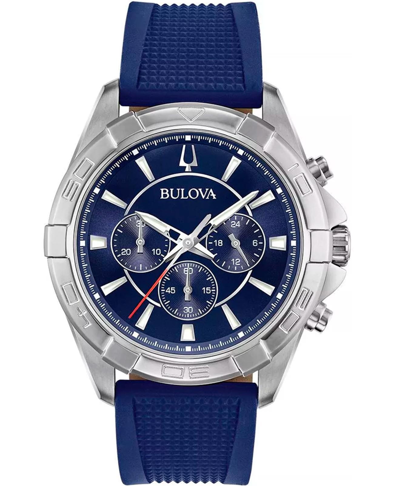 Мужские кварцевые часы-хронографХронографФункция позволяет измерять отрезки времени с особой точностью: часы, минуты, секунды. Верным признаком хронографа является наличие на циферблате 3 дополнительных окошек-счётчиков. Bulova Classic 96K103 – отражающий идеальное сочетание современного дизайна, надёжности и функциональности. Элегантный облик станет превосходным завершением образа, наделив его индивидуальным характером. Корпус из нержавеющей стали диаметром 42 мм идеально сбалансирован и элегантен. Минеральное стеклоМинеральное стеклоМинеральное стекло представляет собой искусственно выращенный минерал кварца. Такое стекло отличается особой устойчивостью к повреждениям и царапинам. Уступает по некоторым качествам сапфировому стеклу. защищает циферблат от царапин и устойчивое к мелким механическим повреждениям.Силиконовый ремешок синего цвета на стандартной застежке обеспечивает комфортное ношение. Стрелки и метки с люминесцентным покрытиемЛюминесцентное покрытиеПозволяет считывать показания времени в темноте. Производители наносят на стрелки, часовые индексы, безель или поверхность циферблата светонакопительный состав, дающий холодное свечение. позволяющие легко определять время даже в темноте. Водозащита 100 метров, позволит плавать, нырять и заниматься другими водными видами спорта. Эта модель – отличный выбор для тех, кто ищет сочетание стиля, качества и функциональности. Часы станут не только полезным аксессуаром, но и выразительным элементом вашего имиджа.