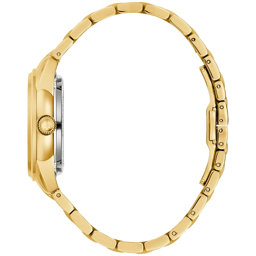 Женские механические часы с автоподзаводом Bulova Automatic Ladies 97L172 – отражающий идеальное сочетание современного дизайна, надёжности и функциональности. Элегантный облик станет превосходным завершением образа, наделив его индивидуальным характером. Корпус из нержавеющей стали с IP-покрытиемIP-покрытиеМетод ионного напыления. Демонстрирует повышенную устойчивость к истиранию, окислению и химическим веществам. Под воздействием высокого давления и температуры около 1500°C молекулы металла надёжно соединяются с частицами корпуса часов. золотистого цвета, диаметром 35 мм идеально сбалансирован и элегантен. Защиту циферблата обеспечивает прочное сапфировое стеклоСапфировое стеклоПрочный и надёжный материал из кристалла сапфира синтетического происхождения, характеризующийся особой твёрдостью и устойчивостью к царапинам и повреждениям., гарантирующее четкость показаний. Циферблат из белого перламутра украшен золотистыми стрелками и метками, а также апертуром, открывающим вид на автоматический механизм. Браслет из нержавеющей стали с IP-покрытиемIP-покрытиеМетод ионного напыления. Демонстрирует повышенную устойчивость к истиранию, окислению и химическим веществам. Под воздействием высокого давления и температуры около 1500°C молекулы металла надёжно соединяются с частицами корпуса часов. на застёжке-бабочке с кнопкамиЗастёжка "бабочка"Такой вид застёжки дополняется предохранителями, помогающими избежать случайного раскрытия браслета. Обладают изящным исполнением. обеспечивает комфортное ношение. Водозащита 30 метров позволит защитить корпус от случайных брызг или капель дождя. Эта модель – отличный выбор для тех, кто ищет сочетание стиля, качества и функциональности. Часы станут не только полезным аксессуаром, но и выразительным элементом вашего имиджа.
