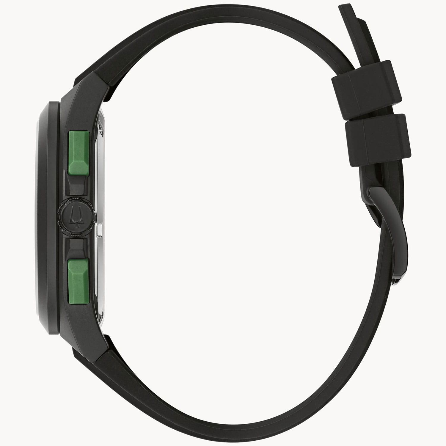 Мужские кварцевые часы-хронографХронографФункция позволяет измерять отрезки времени с особой точностью: часы, минуты, секунды. Верным признаком хронографа является наличие на циферблате 3 дополнительных окошек-счётчиков. Bulova Maquina 98B381 – отражающий идеальное сочетание современного дизайна, надёжности и функциональности. Элегантный облик станет превосходным завершением образа, наделив его индивидуальным характером. Корпус из нержавеющей стали с IP-покрытиемIP-покрытиеМетод ионного напыления. Демонстрирует повышенную устойчивость к истиранию, окислению и химическим веществам. Под воздействием высокого давления и температуры около 1500°C молекулы металла надёжно соединяются с частицами корпуса часов., диаметром 46 мм идеально сбалансирован и элегантен. Защиту циферблата обеспечивает прочное сапфировое стеклоСапфировое стеклоПрочный и надёжный материал из кристалла сапфира синтетического происхождения, характеризующийся особой твёрдостью и устойчивостью к царапинам и повреждениям. гарантирующее четкость показаний. Центральные часовая и минутная стрелки. Силиконовый ремешок со стандартной застежкой обеспечивает комфортное ношение. Апертура даты в позиции 3 часов. Водозащита 100 метров позволит плавать, нырять и заниматься другими водными видами спорта. Стрелки и метки с люминесцентным покрытиемЛюминесцентное покрытиеПозволяет считывать показания времени в темноте. Производители наносят на стрелки, часовые индексы, безель или поверхность циферблата светонакопительный состав, дающий холодное свечение. позволяющие легко определять время даже в темноте. Эта модель – отличный выбор для тех, кто ищет сочетание стиля, качества и функциональности. Часы станут не только полезным аксессуаром, но и выразительным элементом вашего имиджа.