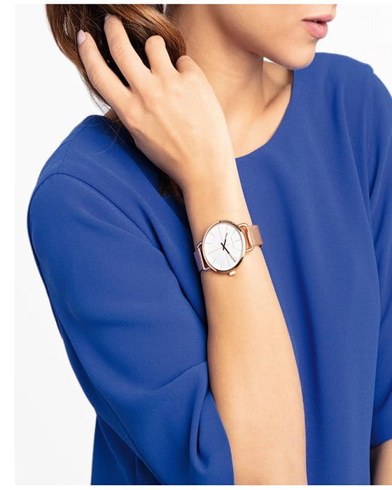 Белый циферблат отражает классический стиль. Стальной браслет миланского плетения стал привлекательной fashion-деталью. Швейцарский кварцевый механизм ETA F05.401. Водонепроницаемость 3 бар. Минеральное стекло. Стрелки с люминесцентной подсветкойЛюминесцентное покрытиеПозволяет считывать показания времени в темноте. Производители наносят на стрелки, часовые индексы, безель или поверхность циферблата светонакопительный состав, дающий холодное свечение.. Цветное PVD-покрытиеPVDУльтратонкое покрытие наносится в технике вакуумного напыления, сочетает в себе нитрид титана особой прочности со слоем золота или оксида хрома. Несёт в себе декоративную или защитную функцию..