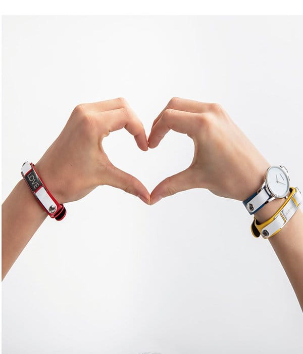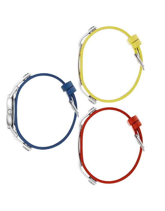 Модель поставляется в комплекте с цветными кожаными ремешками, кнопки позволяют менять его по желанию. Неиспользуемые элементы можно носить как отдельный браслет. Швейцарский кварцевый калибр ETA F05.101 отвечает за высокую точность хода. Минеральное стекло отличается надёжностью, устойчивостью к царапинам.