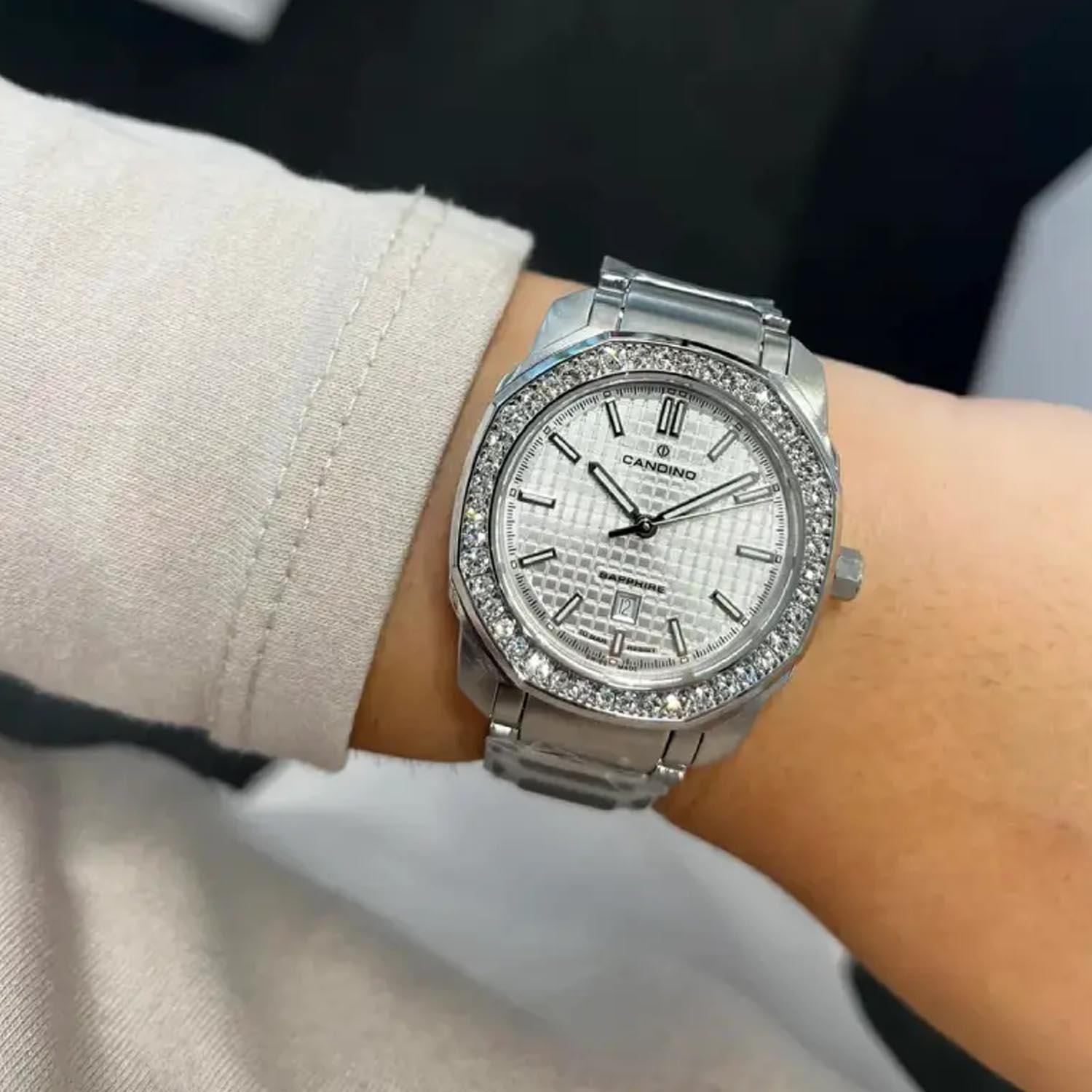Женские наручные часы Candino Elegance C4756/6 с надёжным кварцевым механизмом. Корпус и браслет часов изготовлены из нержавеющей стали. Сапфировое стеклоСапфировое стеклоПрочный и надёжный материал из кристалла сапфира синтетического происхождения, характеризующийся особой твёрдостью и устойчивостью к царапинам и повреждениям. повышенной прозрачности, устойчивое к мелким механическим повреждениям. Стальной браслет на раскладной застёжкеРаскладная застёжкаТакой тип застёжки используется только на браслетах из металла. Она никогда не раскрывается полностью, происходит разделение на 2 и более частей. Раскладывающая застёжка снизит вероятность потери часов к минимуму.. Стрелки и метки с люминесцентным покрытиемЛюминесцентное покрытиеПозволяет считывать показания времени в темноте. Производители наносят на стрелки, часовые индексы, безель или поверхность циферблата светонакопительный состав, дающий холодное свечение.. БезельБезельВнешний ободок, закрепляющий стекло. В спортивных часах так называется поворотное кольцо с делениями на циферблате, выполняет роль таймера – замеряет отрезки времени на шкале. Неподвижный безель – элемент декора. Однонаправленно вращающийся безель на дайверских часах позволяет фиксировать моменты погружения и выныривания на поверхность. инкрустирован кристаллами. Класс водозащиты: 50 метров, позволит защитить корпус от случайных брызг или капель дождя. Окошко даты находится в положении 6 часов.
