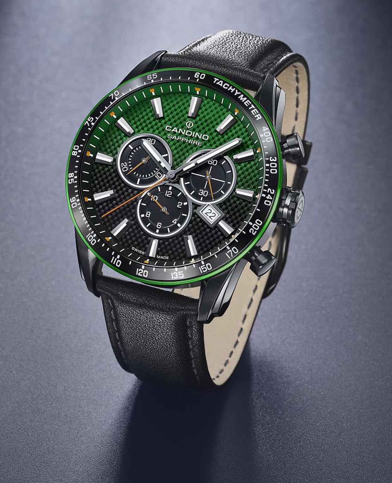 Швейцарские мужские наручные часы-хронографХронографФункция позволяет измерять отрезки времени с особой точностью: часы, минуты, секунды. Верным признаком хронографа является наличие на циферблате 3 дополнительных окошек-счётчиков. Candino Gents Sport C4759/3, кварцевый механизм с высокой точностью. Сапфировое стеклоСапфировое стеклоПрочный и надёжный материал из кристалла сапфира синтетического происхождения, характеризующийся особой твёрдостью и устойчивостью к царапинам и повреждениям. устойчивое к появлению царапин, обладающее высокой прозрачностью. Часы, минуты, секунды. Окошко даты находится в положении 4 часа. Класс водозащиты: 100 метров, позволит плавать, нырять и заниматься другими водными видами спорта. Корпус часов изготовлен из нержавеющей стали с PVD-покрытиемPVDУльтратонкое покрытие наносится в технике вакуумного напыления, сочетает в себе нитрид титана особой прочности со слоем золота или оксида хрома. Несёт в себе декоративную или защитную функцию.. Стрелки и метки с люминесцентным покрытиемЛюминесцентное покрытиеПозволяет считывать показания времени в темноте. Производители наносят на стрелки, часовые индексы, безель или поверхность циферблата светонакопительный состав, дающий холодное свечение.. Кожаный ремешок на стандартной застёжке. БезельБезельВнешний ободок, закрепляющий стекло. В спортивных часах так называется поворотное кольцо с делениями на циферблате, выполняет роль таймера – замеряет отрезки времени на шкале. Неподвижный безель – элемент декора. Однонаправленно вращающийся безель на дайверских часах позволяет фиксировать моменты погружения и выныривания на поверхность. со шкалой тахиметраТахиметрРазмеченная шкала, располагается на ободке или безеле часов. Тахиметр позволяет рассчитать скорость на определённом участке пути, расстояние измеряется в километрах или милях..