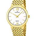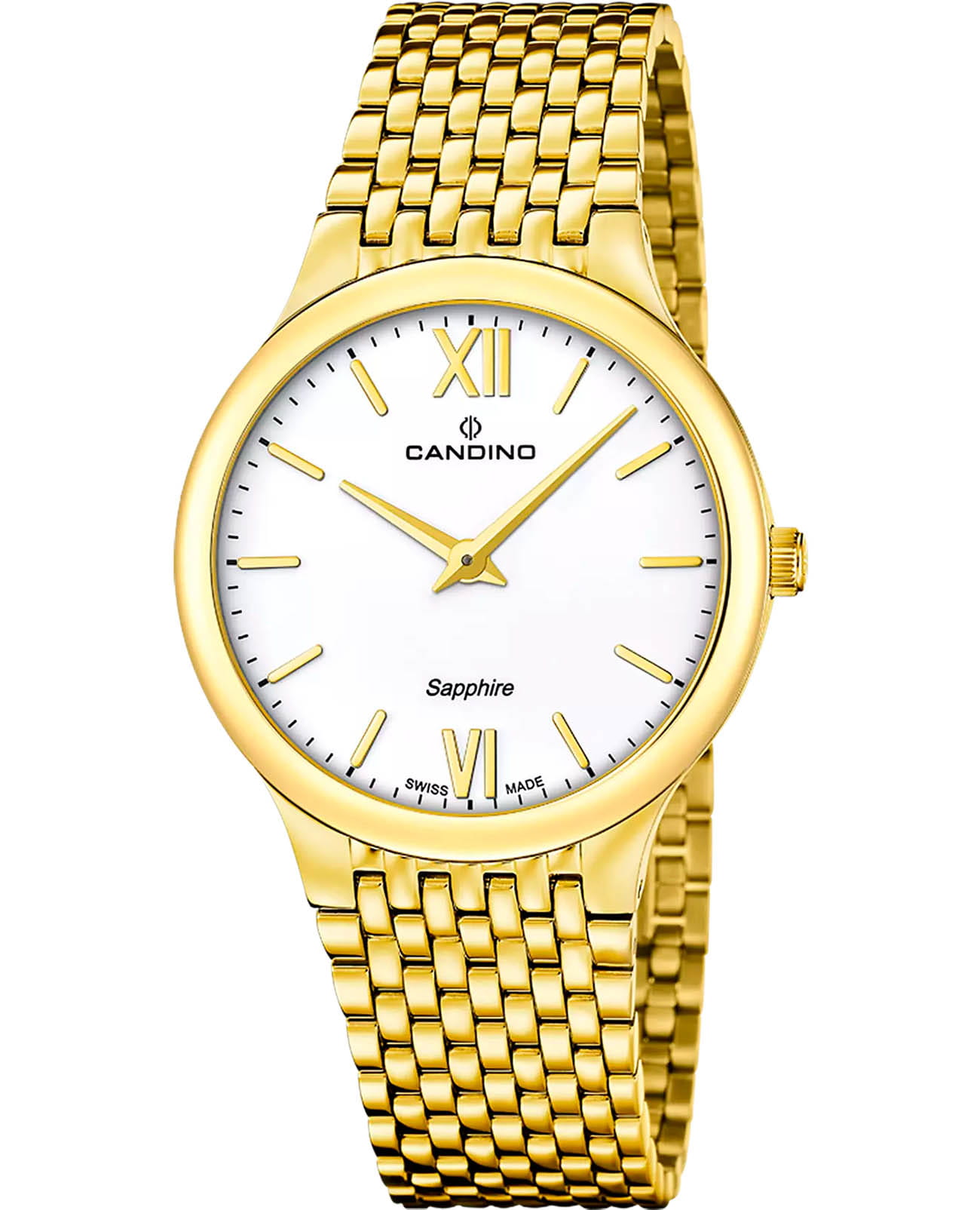 Мужские кварцевые часы Candino из коллекции Series 1947 — это сочетание минимализма, швейцарского качества и современного дизайна. Корпус диаметром 39 мм и толщиной 6 мм выполнен из нержавеющей стали 316L с PVD-покрытиемPVDУльтратонкое покрытие наносится в технике вакуумного напыления, сочетает в себе нитрид титана особой прочности со слоем золота или оксида хрома. Несёт в себе декоративную или защитную функцию. жёлтого золота. Циферблат белого цвета оформлен двумя стрелками без индикации даты, что придаёт дизайну чистоту и элегантность. Циферблат защищён сапфировым стекломСапфировое стеклоПрочный и надёжный материал из кристалла сапфира синтетического происхождения, характеризующийся особой твёрдостью и устойчивостью к царапинам и повреждениям., устойчивым к царапинам. Механизм — кварцевый произведённый в Швейцарии. Часы оснащены стальным браслетом с PVD-покрытиемPVDУльтратонкое покрытие наносится в технике вакуумного напыления, сочетает в себе нитрид титана особой прочности со слоем золота или оксида хрома. Несёт в себе декоративную или защитную функцию. жёлтого золота на застёжке «бабочка» с кнопкамиЗастёжка "бабочка"Такой вид застёжки дополняется предохранителями, помогающими избежать случайного раскрытия браслета. Обладают изящным исполнением. . Водонепроницаемость 50 м позволяет использовать часы в повседневных условиях. Гарантия — 2 года. Идеальный выбор для тех, кто ценит лаконичный стиль, точность и надёжность.