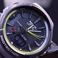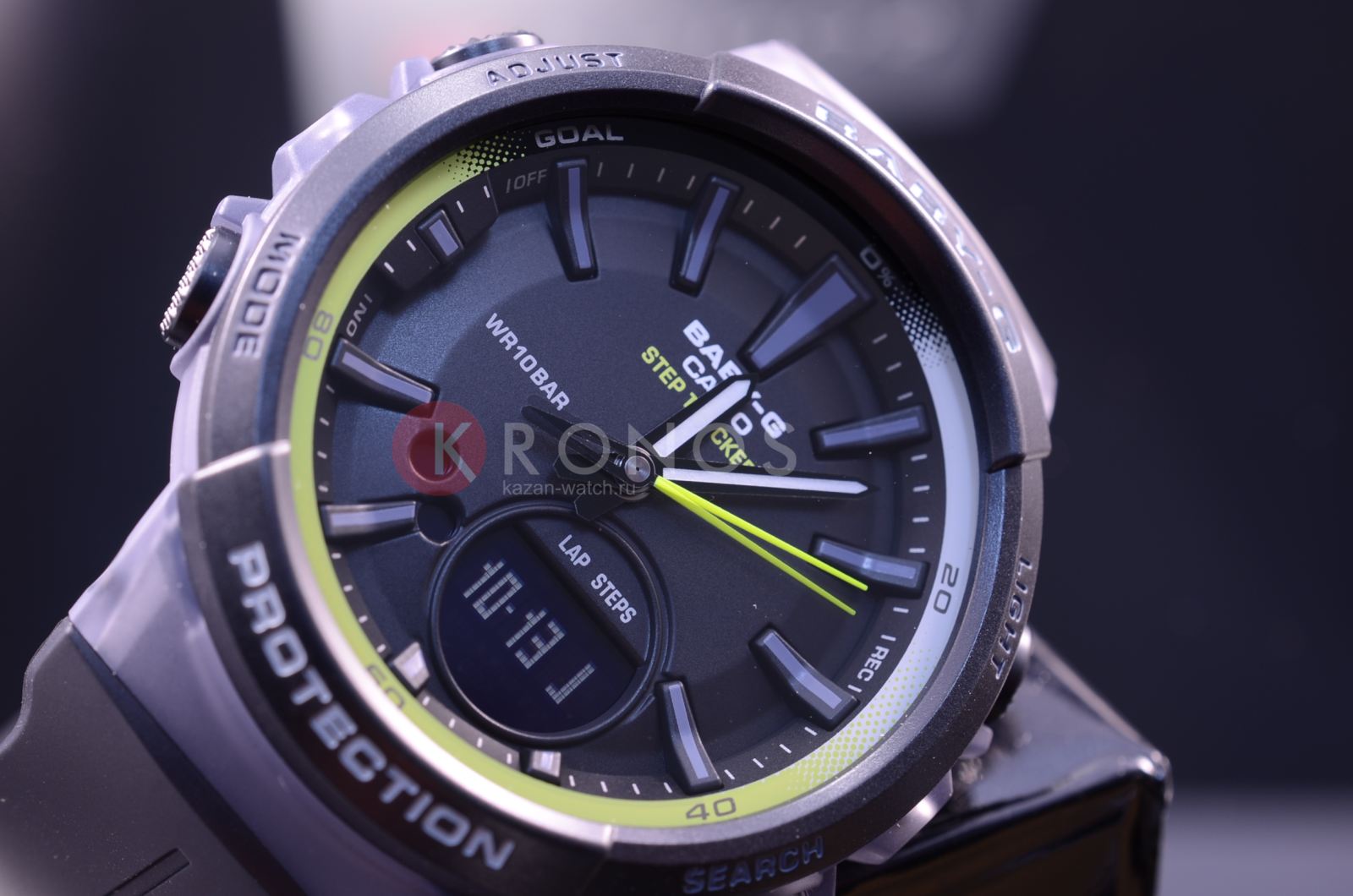 Наручные часы оснащены шагомером, счётчик измеряет количество шагов от 0 до 999999. Предусмотрена возможность установить цель на день. Размечена специальная шкала вокруг безеляБезельВнешний ободок, закрепляющий стекло. В спортивных часах так называется поворотное кольцо с делениями на циферблате, выполняет роль таймера – замеряет отрезки времени на шкале. Неподвижный безель – элемент декора. Однонаправленно вращающийся безель на дайверских часах позволяет фиксировать моменты погружения и выныривания на поверхность., достижение отметки «Goal» означает, что план выполнен. Ударопрочный корпусУдаропрочный корпусМеханизм заключён в корпус, выполненный из современных материалов, устойчивых к ударам, механическим повреждениям и падению с высоты: инновационный пластик, карбон, нержавеющая сталь, титан. сделан из прочного полимера, устойчив к падению, вибрации. Работу японского кварцевого механизма обеспечивает батарейка, рассчитанная на 2 года. Минеральное закаленное стекло. Светодиодная подсветкаСветодиодная подсветкаСветодиодная или LED-подсветка обеспечивает появление яркого холодного свечения за счёт LED-элементов - маленьких лампочек. Они потребляют минимальное количество энергии, чаще всего можно встретить 1 светодиод, в нижней части циферблата.. Водостойкость 10 бар. Включение и выключение звука кнопок. Автокалендарь, будильник, секундомер, таймер обратного отсчёта. Указание второго часового пояса. Габариты: 42,6 x 45,2 x 13,3 мм.