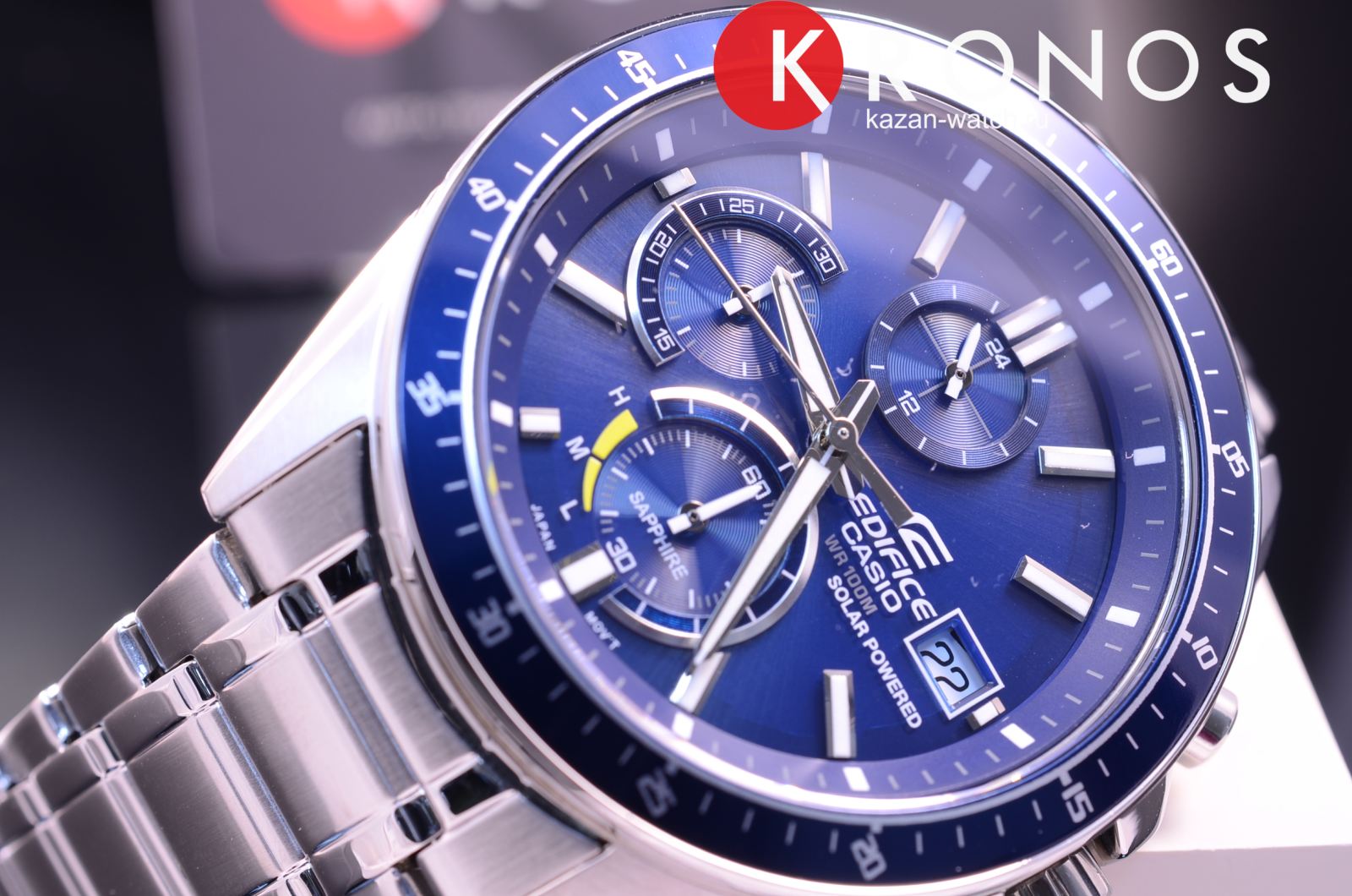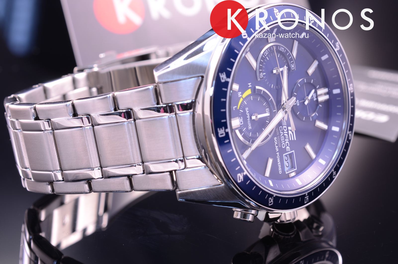 Chronograph. Питание от солнечной энергии, индикатор заряда батареи. Светонакопительное покрытие необрит продолжает светиться в темноте даже после непродолжительного пребывания на свету. Часы-хронограф с секундомером с точностью показаний 1с и временем измерения 30мин. 12-ти и 24-х часовой формат времени. Заводная головка с защитой. Задняя крышка с винтовым фиксатором. Раскладывающаяся застежка, расстегиваемая одним касанием.