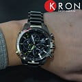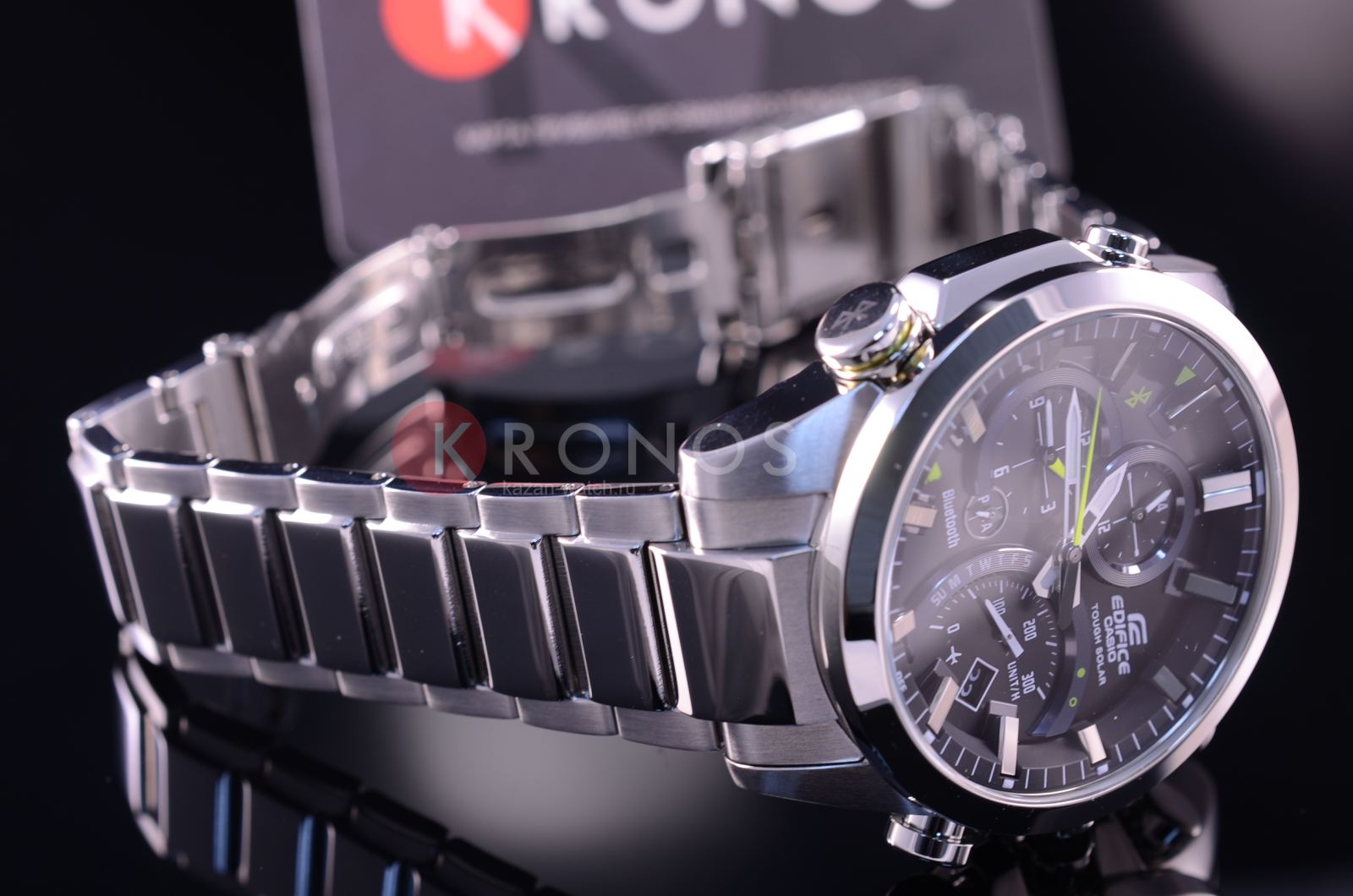 Общее исполнение аксессуара выдержано в автомобильной стилистике, тёмный циферблат отличается оригинальным расположением счётчиков. Наручные часы оснащены технологией BluetoothBluetoothСовременная технология, позволяющая синхронизировать часы с телефоном и переносить данные. Часы с Bluetooth расширяют возможности вашего смартфона и делают его использование ещё более удобным. с низким потреблением энергии, позволяющей часам считывать информацию с интернет-сервера точного времени и обеспечивать абсолютную точность времени. Питание происходит за счёт солнечной батареи - . Водонепроницаемость 100 метров. Минеральное стекло. Люминесцентная подсветкаЛюминесцентное покрытиеПозволяет считывать показания времени в темноте. Производители наносят на стрелки, часовые индексы, безель или поверхность циферблата светонакопительный состав, дающий холодное свечение.. Надёжный стальной браслет. Наличие авиарежима. Функции: уведомление о полученных сообщениях по электронной почте, поиск телефона, отображение числа и дня недели, секундомер, будильник, расчёт средней скорости пройденного маршрута. Габариты: 52 x 48,1 x 14,2 мм.