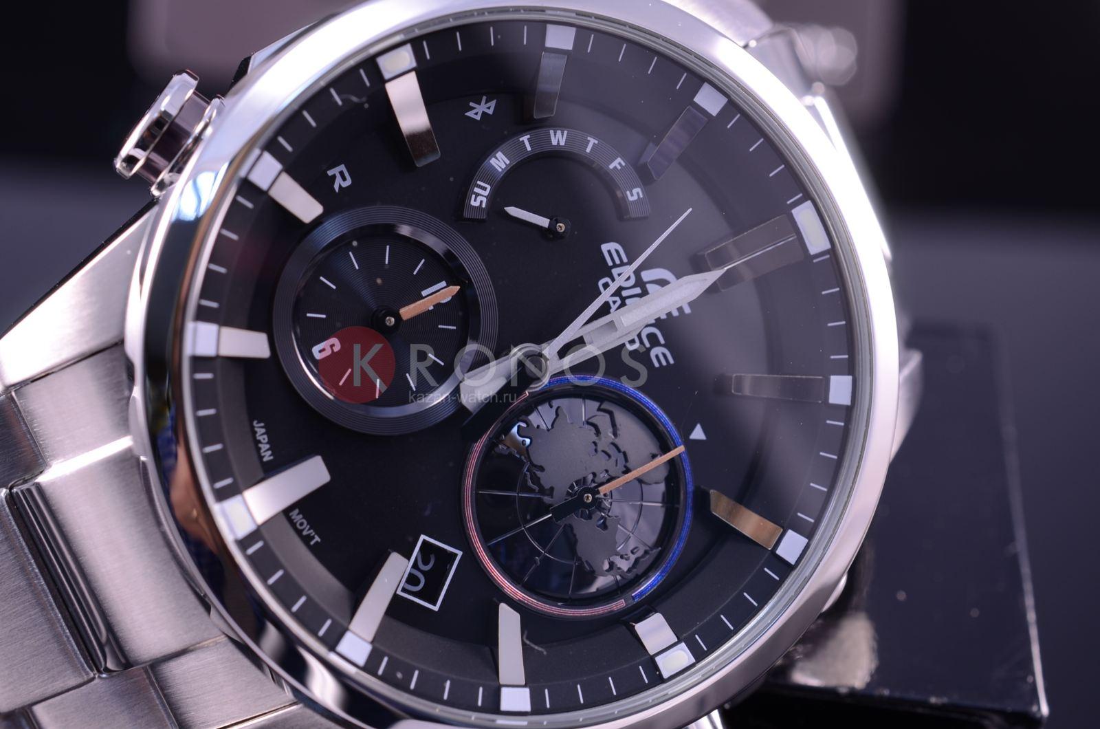 Высокотехнологичный аксессуар в чёрно-серебристой расцветке имеет лаконичное исполнение с оригинальными счётчиками на циферблате. Наручные часы Edifice Smartphone Link оснащены Bluetooth 4.0BluetoothСовременная технология, позволяющая синхронизировать часы с телефоном и переносить данные. Часы с Bluetooth расширяют возможности вашего смартфона и делают его использование ещё более удобным., позволяющей корректировать текущее время и копировать настройки мирового времениМировое время Полезное часовое усложнение, отображающее время в основных городах и известных областях по всему миру, оно связано с часовыми поясами, удобно для путешественников и бизнесменов. с помощью интернет-сервиса. Часы не нуждаются в подзаводе благодаря технологии питания от солнечного света . Без подзарядки модель может проработать до 5 месяцев. Люминесцентная подсветка NeobriteПодсветка NeobriteИспользование светонакопительных составов на основе сульфида цинка или алюмината стронция, яркий свет можно наблюдать на протяжении 6-10 часов после «зарядки» часов около источника света.. Авиарежим. Минеральное стекло. Ударопрочный корпусУдаропрочный корпусМеханизм заключён в корпус, выполненный из современных материалов, устойчивых к ударам, механическим повреждениям и падению с высоты: инновационный пластик, карбон, нержавеющая сталь, титан. и браслет из нержавеющей стали 316L. Водостойкость 100 метров. Завинчивающаяся заводная головка. Функция поиска телефона, приём уведомлений о новых письмах электронной посты, секундомер, автоматический календарь, расчёт средней скорости пройденного маршрута. Габариты: 47,3 x 51,9 x 13,3 мм.