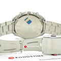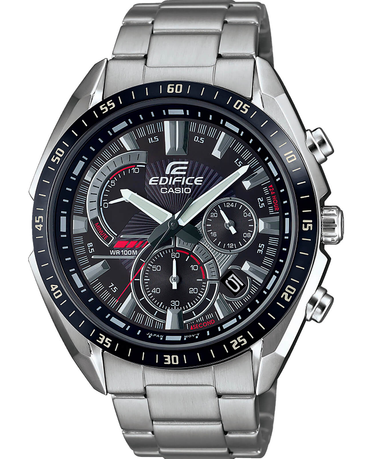 Аксессуар с автомобильным характером имеет ударопрочный корпусУдаропрочный корпусМеханизм заключён в корпус, выполненный из современных материалов, устойчивых к ударам, механическим повреждениям и падению с высоты: инновационный пластик, карбон, нержавеющая сталь, титан. из нержавеющей стали 316L, необычно смотрятся угловатые грани. На чёрном циферблате с красными акцентами располагается множество окошек и счётчиков, но это не добавляет перегруженности. Японский кварцевый механизм с высокой точностью хода приводится в работу за счёт батарейки, рассчитанной на 3 года. БезельБезельВнешний ободок, закрепляющий стекло. В спортивных часах так называется поворотное кольцо с делениями на циферблате, выполняет роль таймера – замеряет отрезки времени на шкале. Неподвижный безель – элемент декора. Однонаправленно вращающийся безель на дайверских часах позволяет фиксировать моменты погружения и выныривания на поверхность. с чёрным IP-покрытиемIP-покрытиеМетод ионного напыления. Демонстрирует повышенную устойчивость к истиранию, окислению и химическим веществам. Под воздействием высокого давления и температуры около 1500°C молекулы металла надёжно соединяются с частицами корпуса часов.. Надёжный стальной браслет. Водостойкость 10 бар. Завинчивающаяся задняя крышка. Минеральное стекло. Крупная индикация даты, хронографХронографФункция позволяет измерять отрезки времени с особой точностью: часы, минуты, секунды. Верным признаком хронографа является наличие на циферблате 3 дополнительных окошек-счётчиков., секундомер. Габариты: 44,6 x 50 x 12,4 мм.