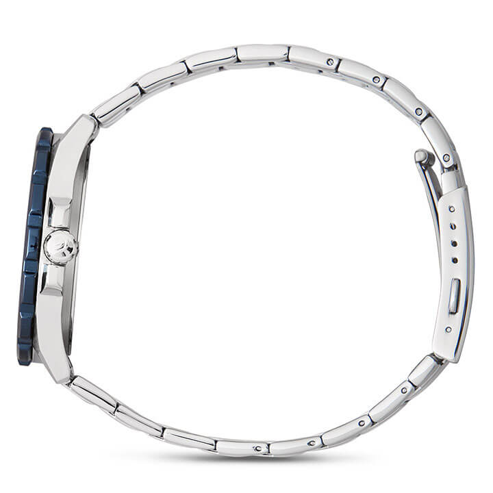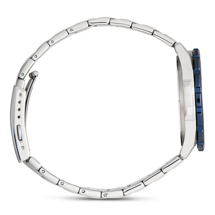 Это отличное решение для современных мужчин, стремящихся выглядеть стильно в любой ситуации. Синий циферблат с крупной индикацией времени дополнен яркими акцентами голубого цвета, что придаёт общему дополнению динамичность. Прослеживается дайверский характер благодаря однонаправленно вращающемуся фактурному безелюБезельВнешний ободок, закрепляющий стекло. В спортивных часах так называется поворотное кольцо с делениями на циферблате, выполняет роль таймера – замеряет отрезки времени на шкале. Неподвижный безель – элемент декора. Однонаправленно вращающийся безель на дайверских часах позволяет фиксировать моменты погружения и выныривания на поверхность.. И браслет, и ударопрочный корпусУдаропрочный корпусМеханизм заключён в корпус, выполненный из современных материалов, устойчивых к ударам, механическим повреждениям и падению с высоты: инновационный пластик, карбон, нержавеющая сталь, титан. сделаны из стали 316L с противокоррозионными свойствами. Кварцевый японский механизм отличается точностью хода +/- 20 секунд в месяц. Срок службы батарейки - 3 года. Частичное IP-покрытиеIP-покрытиеМетод ионного напыления. Демонстрирует повышенную устойчивость к истиранию, окислению и химическим веществам. Под воздействием высокого давления и температуры около 1500°C молекулы металла надёжно соединяются с частицами корпуса часов.. Минеральное стекло. Люминесцентное покрытие NeobriteПодсветка NeobriteИспользование светонакопительных составов на основе сульфида цинка или алюмината стронция, яркий свет можно наблюдать на протяжении 6-10 часов после «зарядки» часов около источника света.. Водостойкость 100 метров. Задняя крышка с винтовым фиксатором. Заводная головка с системой защиты. Индикация числа. Габариты: 47,2 x 41 x 10,4 мм.