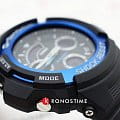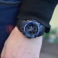 Компактный аксессуар имеет противоударный корпусУдаропрочный корпусМеханизм заключён в корпус, выполненный из современных материалов, устойчивых к ударам, механическим повреждениям и падению с высоты: инновационный пластик, карбон, нержавеющая сталь, титан. из полимерного материала, способного выдерживать падения с высоты и повреждения. Привлекательно смотрится безельБезельВнешний ободок, закрепляющий стекло. В спортивных часах так называется поворотное кольцо с делениями на циферблате, выполняет роль таймера – замеряет отрезки времени на шкале. Неподвижный безель – элемент декора. Однонаправленно вращающийся безель на дайверских часах позволяет фиксировать моменты погружения и выныривания на поверхность. из нержавеющей стали 316L с синим IP-покрытиемIP-покрытиеМетод ионного напыления. Демонстрирует повышенную устойчивость к истиранию, окислению и химическим веществам. Под воздействием высокого давления и температуры около 1500°C молекулы металла надёжно соединяются с частицами корпуса часов.. Аналого-цифровые часы работают от батарейки, рассчитанной на 3 года безупречной эксплуатации. Минеральное стекло. Автоматическая светодиодная подсветкаСветодиодная подсветкаСветодиодная или LED-подсветка обеспечивает появление яркого холодного свечения за счёт LED-элементов - маленьких лампочек. Они потребляют минимальное количество энергии, чаще всего можно встретить 1 светодиод, в нижней части циферблата. дисплея, стрелки и метки с люминесцентным покрытиемЛюминесцентное покрытиеПозволяет считывать показания времени в темноте. Производители наносят на стрелки, часовые индексы, безель или поверхность циферблата светонакопительный состав, дающий холодное свечение.. 12/24-часовое отображение времени. Надёжный полимерный ремешок. Водостойкость 200 метров. Дополнительные возможности: таймер, будильник, мировое времяМировое время Полезное часовое усложнение, отображающее время в основных городах и известных областях по всему миру, оно связано с часовыми поясами, удобно для путешественников и бизнесменов. , секундомер, автоматический календарь. Габариты: 46,4 x 52 x 14,9 мм.