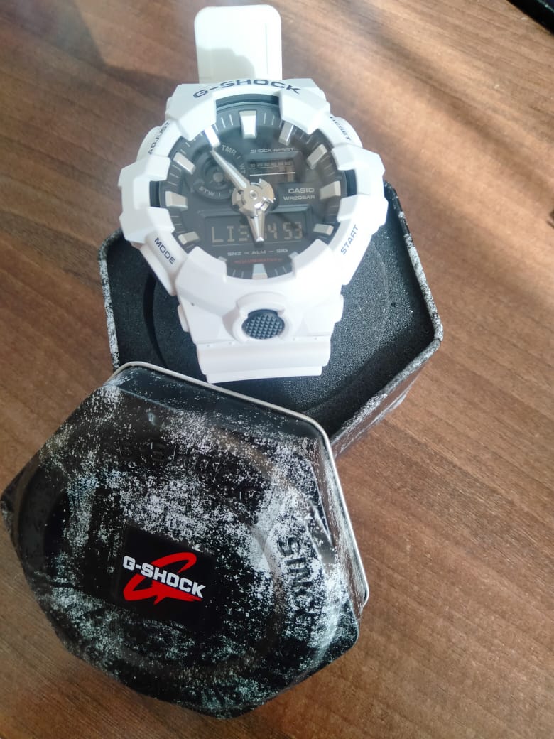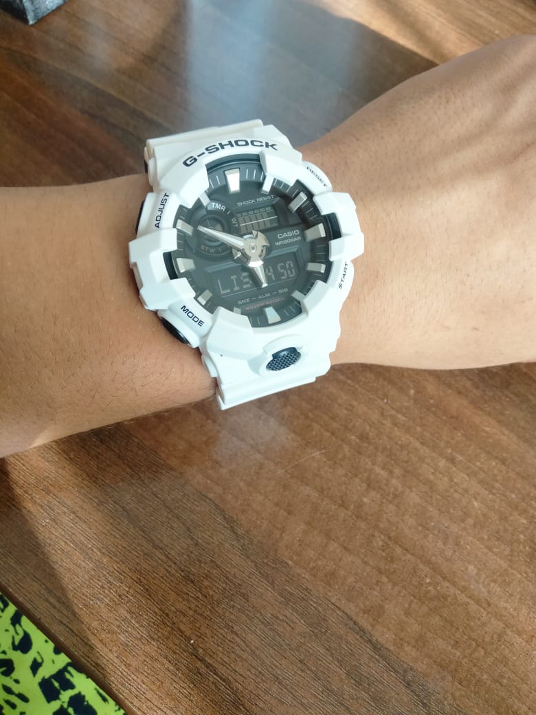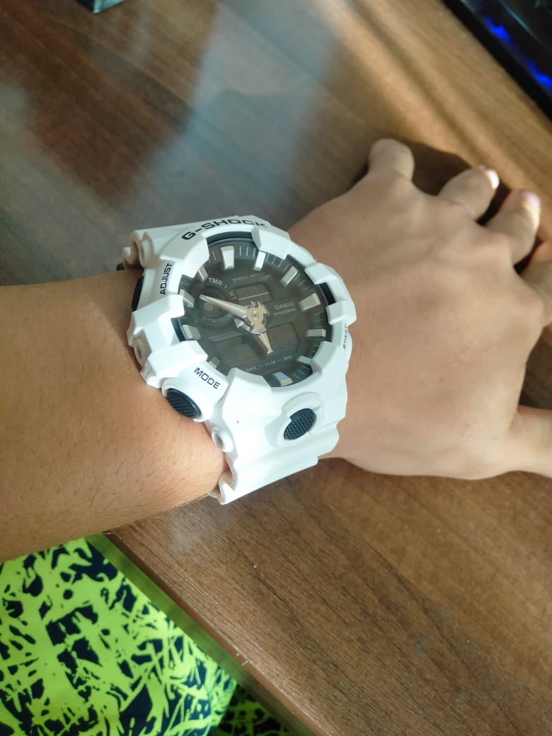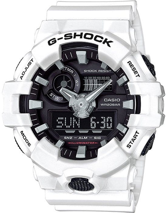 Японские мужские часы-хронографХронографФункция позволяет измерять отрезки времени с особой точностью: часы, минуты, секунды. Верным признаком хронографа является наличие на циферблате 3 дополнительных окошек-счётчиков. Casio G-Shock GA-700-7AER. Противоударный пластиковый корпус с карбоновыми волокнами более прочный и, в то же время, более легкий. Минеральное стеклоМинеральное стеклоМинеральное стекло представляет собой искусственно выращенный минерал кварца. Такое стекло отличается особой устойчивостью к повреждениям и царапинам. Уступает по некоторым качествам сапфировому стеклу. устойчивое к появлению царапин, обладающее высокой прозрачностью. Ударопрочный корпусУдаропрочный корпусМеханизм заключён в корпус, выполненный из современных материалов, устойчивых к ударам, механическим повреждениям и падению с высоты: инновационный пластик, карбон, нержавеющая сталь, титан. защищает механизм от ударов и вибрации. Многокомпонентный циферблат состоит из цифровых окошек указателей числа и дня недели, а также индикатора режима работы часов, который расположен в позиции 9 часов и выполнен в виде пропеллера. Светодиодная автоподсветка NeobriteПодсветка NeobriteИспользование светонакопительных составов на основе сульфида цинка или алюмината стронция, яркий свет можно наблюдать на протяжении 6-10 часов после «зарядки» часов около источника света. - при повороте часов в сторону лица подсветка дисплея осуществляется автоматически. Настраиваемое послесвечение 1,5 или 3сек. Мировое времяМировое время Полезное часовое усложнение, отображающее время в основных городах и известных областях по всему миру, оно связано с часовыми поясами, удобно для путешественников и бизнесменов. – 48 городов (29 часовых поясов). СекундомерСекундомерСекундоме́р — прибор, способный измерять интервалы времени с точностью до долей секунды. с точностью измерения 1/100 секунды и измерением до 23 часов 59 минут 59,99 cек. ТаймерТаймерОтсчитывает секунды в обратном направлении в заданном интервале времени. обратного отсчета (диапазон времени 24 часа), автоматический календарь, 12/24 отображение времени. 5 будильниковБудильникБуди́льник — часы, в заданный момент времени подающие звуковой, световой и/или в редких случаях другой сигнал., один с функцией Snooze, ежечасный сигнал. Класс водозащиты: 200 метров, позволит плавать, нырять и заниматься другими водными видами спорта. Ремешок из полимерного материала на стандартной застежке.