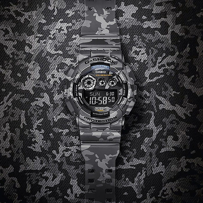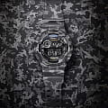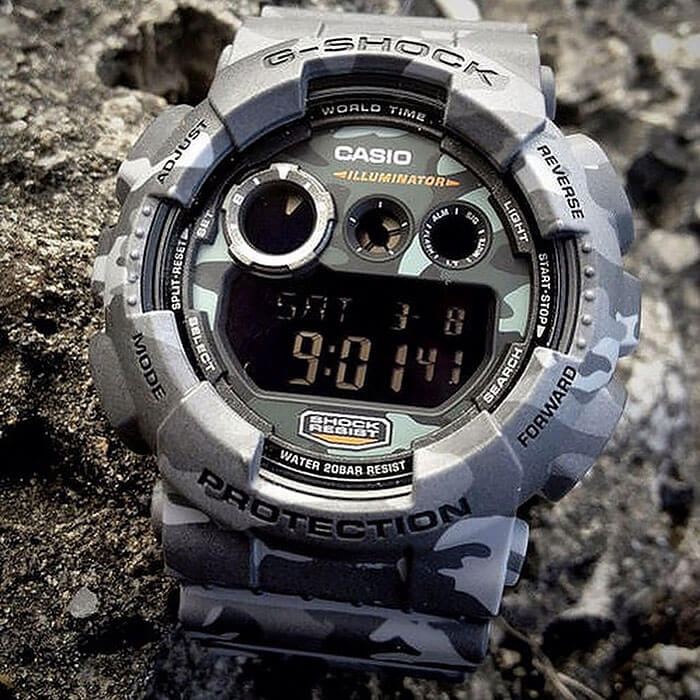 Наручные часы обладают внушительными размерами, благодаря массивному ударопрочному корпусуУдаропрочный корпусМеханизм заключён в корпус, выполненный из современных материалов, устойчивых к ударам, механическим повреждениям и падению с высоты: инновационный пластик, карбон, нержавеющая сталь, титан. и необычному дизайну они приметно смотрятся на запястье. Их поверхность имеет камуфляжный принт, циферблат же оставлен в минималистичном исполнении. Японский кварцевый механизм работает за счёт батарейки, срок службы которой составляет 7 лет. Корпус и браслет из высокопрочного пластика. Автоматическая светодиодная подсветкаСветодиодная подсветкаСветодиодная или LED-подсветка обеспечивает появление яркого холодного свечения за счёт LED-элементов - маленьких лампочек. Они потребляют минимальное количество энергии, чаще всего можно встретить 1 светодиод, в нижней части циферблата.. Закаленное минеральное стекло. Водозащита 200 метров. Включение и выключение функции кнопок. Функции: таймер обратного отсчёта, 5 будильников, хронографХронографФункция позволяет измерять отрезки времени с особой точностью: часы, минуты, секунды. Верным признаком хронографа является наличие на циферблате 3 дополнительных окошек-счётчиков., секундомер, мировое времяМировое время Полезное часовое усложнение, отображающее время в основных городах и известных областях по всему миру, оно связано с часовыми поясами, удобно для путешественников и бизнесменов. . Габариты: 55 x 51,2 x 17,4 мм.