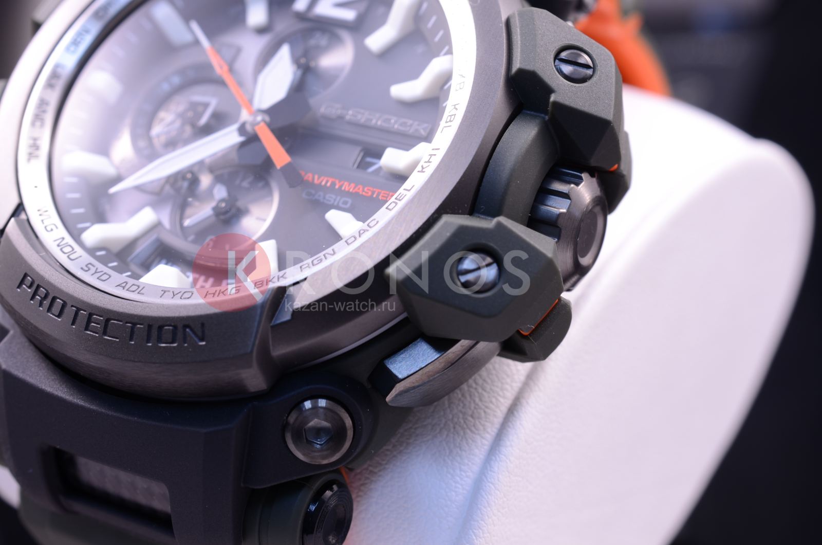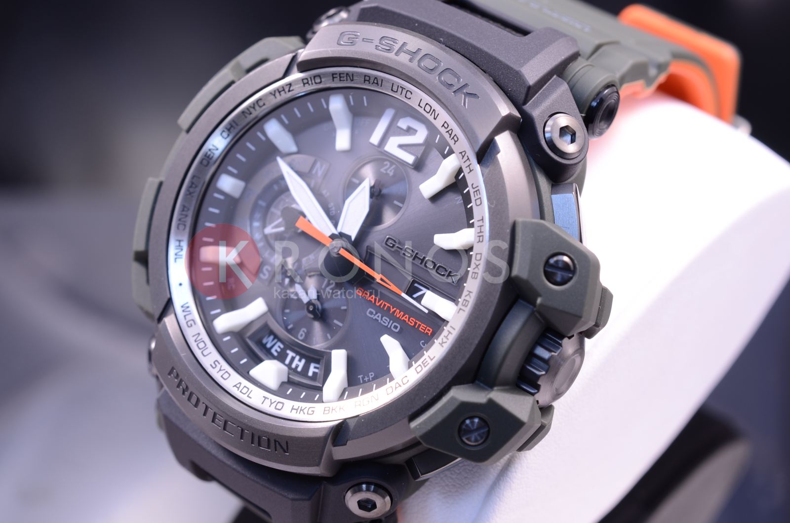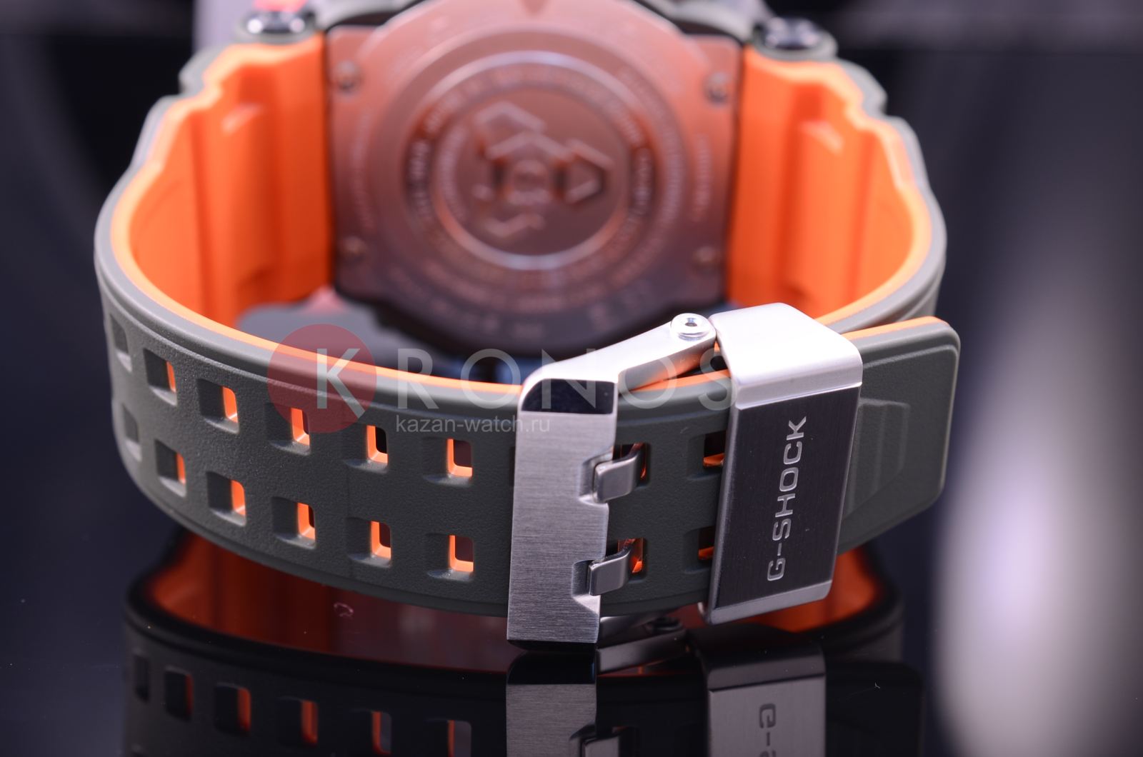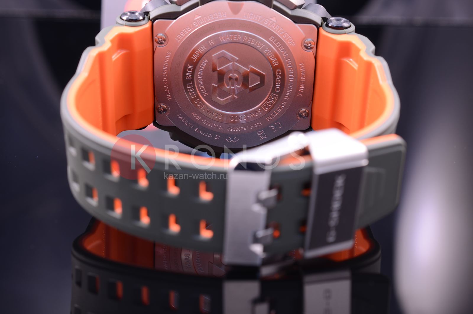 Флагманские G-SHOCK GPW-2000 в корпусе цвета хаки с темно-серым стальным безелем и ярко-оранжевой внутренней поверхностью ремешка. У данной модели 3 независимых вида синхронизации времени: GPS- и радио-синхронизация времени с атомными часами в разных частях света, а также синхронизация по Bluetooth с приложением G-Shock Connected на вашем смартфоне.