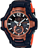 Модель линейки Gravitymaster с оранжевыми деталями привлекает необычным оформлением, дисплей напоминает кабину пассажирского самолёта. Часы в пилотной тематике отличаются цифровым дисплеем с широким углом обзора и самым высоким разрешением среди G-Shock, циферблатом с крупной индикацией времени. Авиаторской фишкой стал таймер обратного отсчёта, позволяющий выбрать число, месяц или год, запланированному событию можно дать название. Противоударный корпусУдаропрочный корпусМеханизм заключён в корпус, выполненный из современных материалов, устойчивых к ударам, механическим повреждениям и падению с высоты: инновационный пластик, карбон, нержавеющая сталь, титан. из полимерного материала. Стальной безельБезельВнешний ободок, закрепляющий стекло. В спортивных часах так называется поворотное кольцо с делениями на циферблате, выполняет роль таймера – замеряет отрезки времени на шкале. Неподвижный безель – элемент декора. Однонаправленно вращающийся безель на дайверских часах позволяет фиксировать моменты погружения и выныривания на поверхность. c IP-покрытиемIP-покрытиеМетод ионного напыления. Демонстрирует повышенную устойчивость к истиранию, окислению и химическим веществам. Под воздействием высокого давления и температуры около 1500°C молекулы металла надёжно соединяются с частицами корпуса часов.. Питание от солнечной батареи . Индикатор состояния элемента питания. Функция перемещения стрелок для удобного просмотра всех показателей. Синхронизация Bluetooth 4.0BluetoothСовременная технология, позволяющая синхронизировать часы с телефоном и переносить данные. Часы с Bluetooth расширяют возможности вашего смартфона и делают его использование ещё более удобным.. Минеральное стекло. Водостойкость 20 бар. СветодиоднаяСветодиодная подсветкаСветодиодная или LED-подсветка обеспечивает появление яркого холодного свечения за счёт LED-элементов - маленьких лампочек. Они потребляют минимальное количество энергии, чаще всего можно встретить 1 светодиод, в нижней части циферблата. подсветка и покрытие стрелок NeobriteПодсветка NeobriteИспользование светонакопительных составов на основе сульфида цинка или алюмината стронция, яркий свет можно наблюдать на протяжении 6-10 часов после «зарядки» часов около источника света.. Поиск телефона, мировое времяМировое время Полезное часовое усложнение, отображающее время в основных городах и известных областях по всему миру, оно связано с часовыми поясами, удобно для путешественников и бизнесменов. , секундомер, будильник, координированное время UTCUTCВсемирное кординационное время, не имеющее привязки к географическому положению Гринвича, основывается на атомном отсчёте времени. Регулировка времени осуществляется более точно, чем устаревшее GMT.