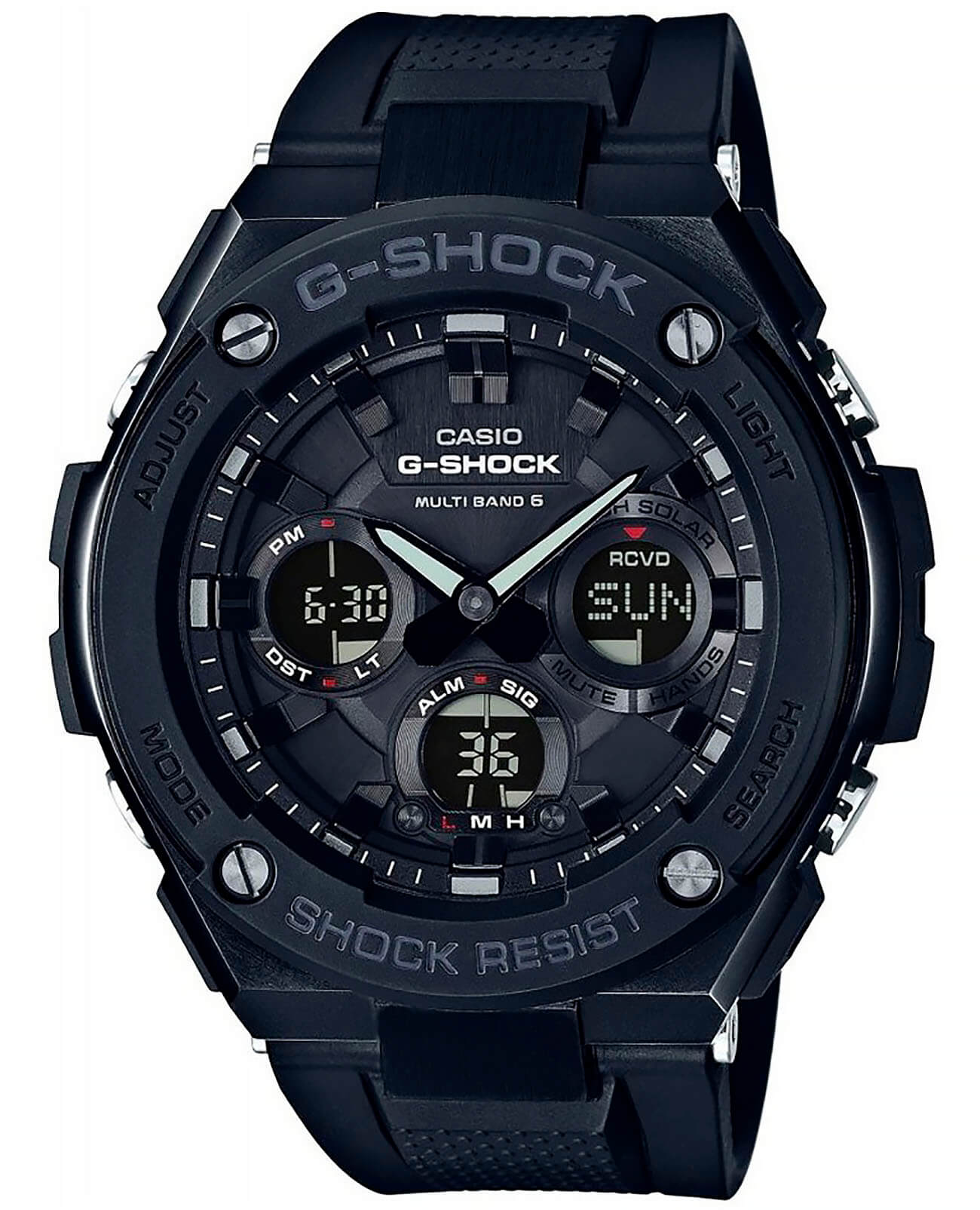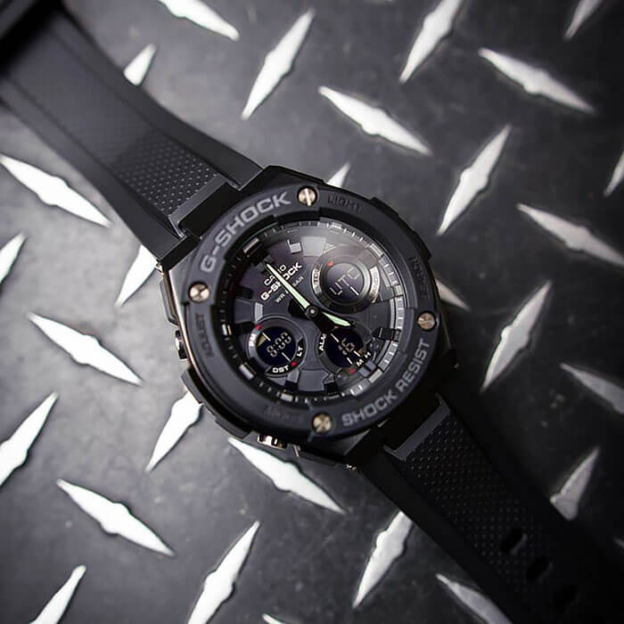 Наручные часы в чёрном исполнении представляют собой действительно универсальный аксессуар. Их особенность заключается в наличии противоударного корпусаУдаропрочный корпусМеханизм заключён в корпус, выполненный из современных материалов, устойчивых к ударам, механическим повреждениям и падению с высоты: инновационный пластик, карбон, нержавеющая сталь, титан. с усиленной конструкцией: между слоями из нержавеющей стали 316L есть амортизирующая прокладка из полимерного материала. Это позволяет японскому кварцевому механизму оставаться максимально защищённым. Энергия для функционирования запасается солнечной батареей - технология . Индикатор уровня заряда аккумулятора. Возможность перемещения стрелок для удобной читаемости показателей с циферблата. Водозащита 20 бар. СветодиоднаяСветодиодная подсветкаСветодиодная или LED-подсветка обеспечивает появление яркого холодного свечения за счёт LED-элементов - маленьких лампочек. Они потребляют минимальное количество энергии, чаще всего можно встретить 1 светодиод, в нижней части циферблата. и люминесцентная подсветкаЛюминесцентное покрытиеПозволяет считывать показания времени в темноте. Производители наносят на стрелки, часовые индексы, безель или поверхность циферблата светонакопительный состав, дающий холодное свечение.. Коррекция текущего времени радиосигналом, мировое времяМировое время Полезное часовое усложнение, отображающее время в основных городах и известных областях по всему миру, оно связано с часовыми поясами, удобно для путешественников и бизнесменов. , таймер, 5 будильников, хронографХронографФункция позволяет измерять отрезки времени с особой точностью: часы, минуты, секунды. Верным признаком хронографа является наличие на циферблате 3 дополнительных окошек-счётчиков., секундомер, UTCUTCВсемирное кординационное время, не имеющее привязки к географическому положению Гринвича, основывается на атомном отсчёте времени. Регулировка времени осуществляется более точно, чем устаревшее GMT.