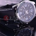 Наручные часы отличаются классическим исполнением, благодаря чему модель можно носить как с деловым костюмом, так и с повседневным свитером. Они имеют корпус из гипоаллергенной латуни, отличающийся лёгкостью. Батарейка для работы кварцевого механизма рассчитана на 3 года. Заводная головка с защитой. Водостойкость 50 метров. Люминесцентная подсветкаЛюминесцентное покрытиеПозволяет считывать показания времени в темноте. Производители наносят на стрелки, часовые индексы, безель или поверхность циферблата светонакопительный состав, дающий холодное свечение.. Минеральное стекло. Чёрный ремешок из натуральной кожи с контрастной прострочкой. Окошко даты. Габариты: 50 x 44,9 x 9,4 мм.