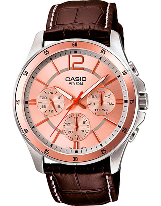 Мужские японские наручные часы из линейки MTP Collection умело сочетают в себе винтажные элементы и спортивный стиль, часы придутся по вкусу ценителям японского качества и лаконичности. Высокотехнологичный аксессуар обладает строгим стилем и традиционной формой циферблата. Сдержанные, классические цвета и плавные линии позволяют носить часы, не снимая, их универсальность идеально подходит для делового костюма, повседневной одежды или образа для вечернего выхода. Для корпуса использована нержавеющая сталь 316L, за счёт чего достигается повышенная устойчивость к повреждениям и ударам. Надежные часы которые прослужат много лет. Модель комплектуется надёжным механизмом, точность хода которого составляет +/- 20 сек/мес.